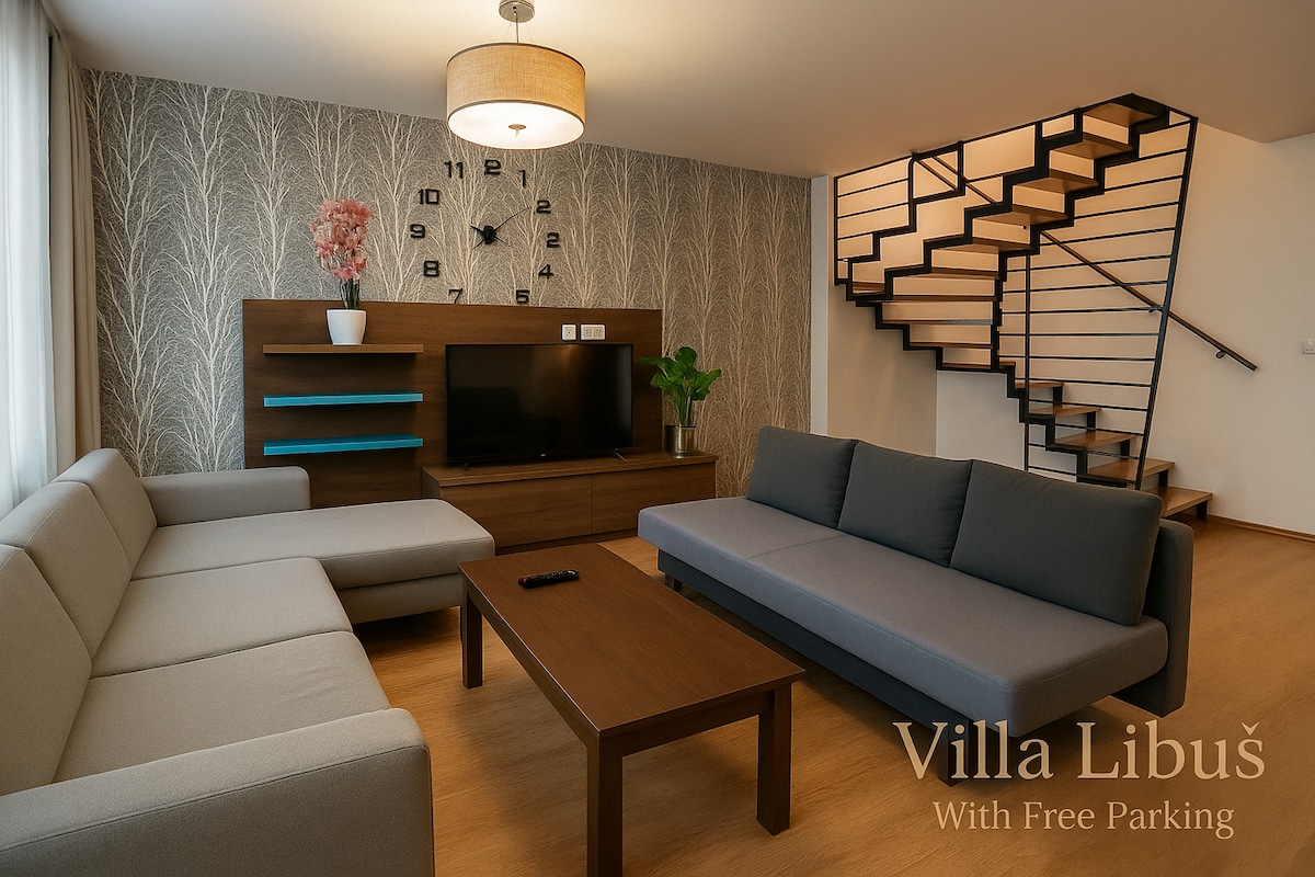 Moderní Městský Styl ubytování v klidné rezidenční části města s výbornou dostupností do centra, parkování, privátní zahrada. Na každém podlaží 3 dvoulůžkové pokoje (celkem 6) vybavené s důrazem na maximální pohodlí. Lůžkoviny a froté ve vysokém standardu, individuální klimatizace a topení, Wifi a Smart TV na každém pokoji. Sdílené společenské prostory s majiteli s plně vybavenou kuchyní nabízí posezení pro 12 osob, relaxační část volně navazuje na terasu.