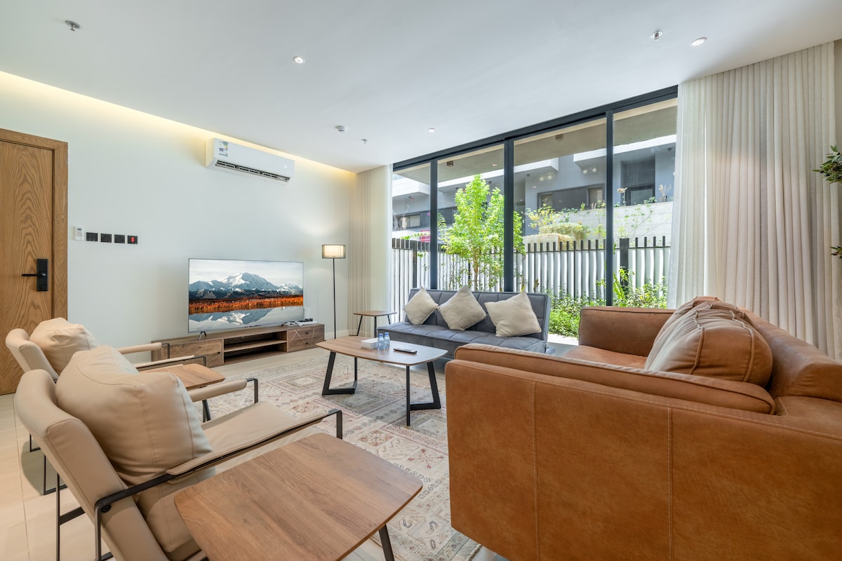 अल यास्मिनमधील या मोहक लाकडी डिझाईन केलेल्या अपार्टमेंटमध्ये अतुलनीय लक्झरीचा अनुभव घ्या, ओलाया मेन रोडपासून फक्त पायऱ्या. 3 प्रशस्त बेडरूम्स, एक स्टाईलिश लिव्हिंग रूम आणि जबरदस्त आकर्षक टॉवर व्ह्यूजसह खाजगी बॅकयार्डचा आनंद घ्या. आराम, प्रायव्हसी आणि प्रमुख लोकेशनच्या शोधात असलेल्या कुटुंबांसाठी आणि प्रवाशांसाठी योग्य. रियाधच्या मध्यभागी असलेल्या उबदार, उंचावरच्या वास्तव्यासाठी प्रत्येक तपशील विचारपूर्वक तयार केला जातो.