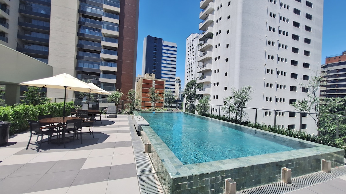कॅम्पो बेलोमधील आधुनिक स्टुडिओ, रूफटॉप, स्विमिंग पूल, फिटनेस सेंटर, सॉना, हॉट टब आणि को - वर्किंगसह. सबवेपासून 50 मीटर आणि काँगोन्हासपासून 10 मिनिटांच्या अंतरावर. बेड बॉक्स, एअर कंडिशनिंग, बाल्कनी, टीव्ही आणि सुसज्ज किचन. कव्हर केलेले गॅरेज समाविष्ट आहे. एसपीमध्ये आराम, शैली आणि व्यावहारिकता शोधत असलेल्यांसाठी योग्य!