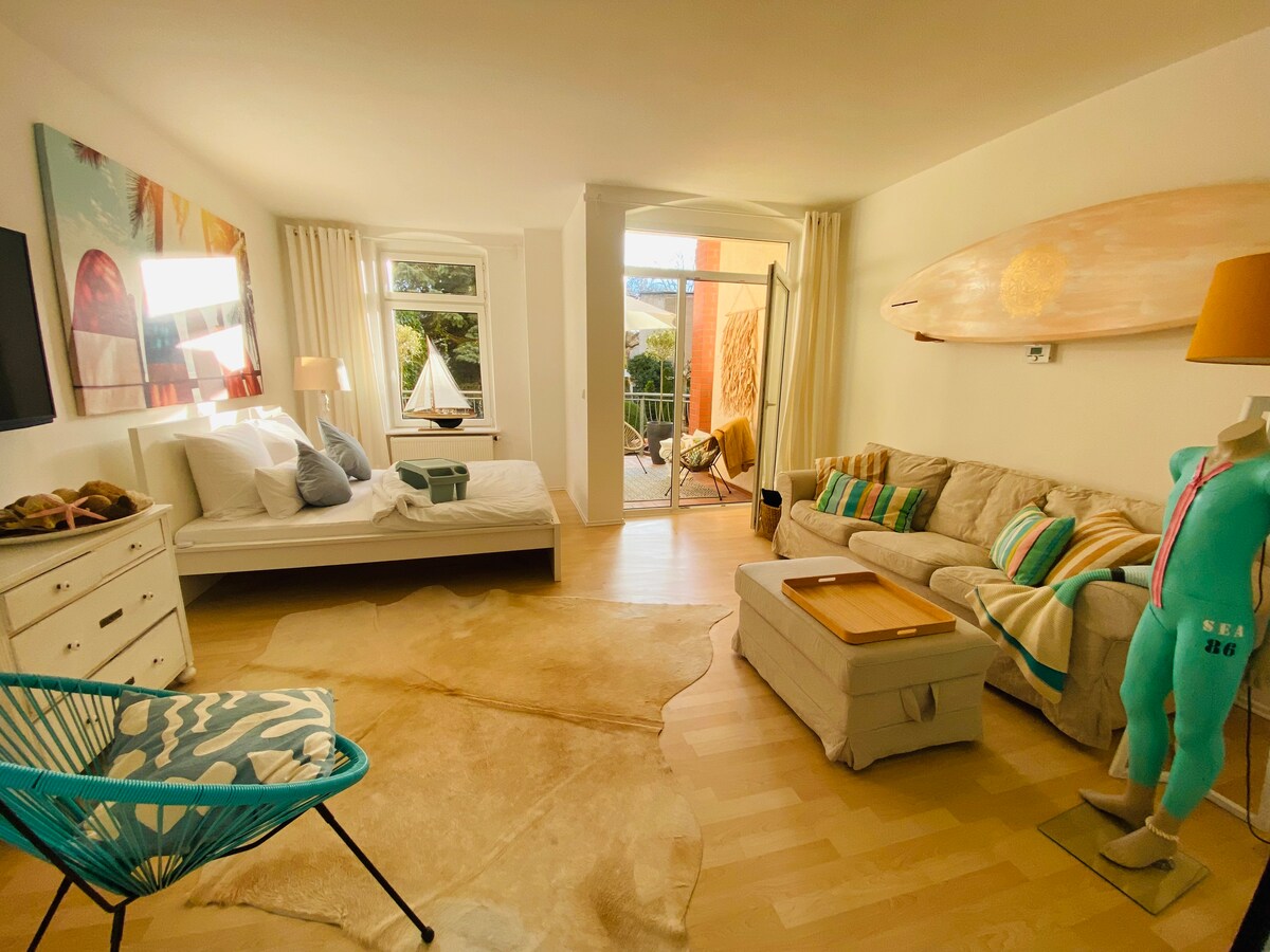 स्वागत आहे! दोन कुटुंबांच्या घराच्या उंचावलेल्या तळमजल्यावर एक आधुनिक सुसज्ज, लहान स्टुडिओ तुमची वाट पाहत आहे. किचन तुम्हाला आवश्यक असलेल्या सर्व गोष्टींनी सुसज्ज आहे: कॅप्सूल कॉफी मशीन, केटल, मायक्रोवेव्ह, सिरॅमिक हॉब, फ्रिज. दृश्य आमच्या सुंदर बागेत जाते, तिथे सायकली पार्क केल्या जाऊ शकतात. कार थेट घरासमोर पार्क केली जाऊ शकते. 10 मिनिटांत तुम्ही सुंदर शहराच्या मध्यभागी किंवा जवळच्या तलावाजवळ 15 मिनिटांत आहात. कोणतेही मध्यवर्ती लोकेशन नाही!