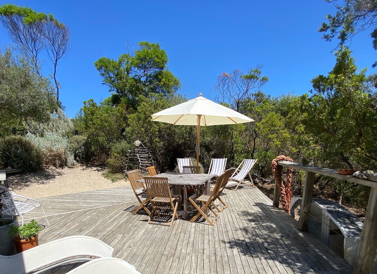 एक खाजगी किनारपट्टीची कॉटेज, उन्हाळ्यासाठी आदर्श. समुद्रापासून फक्त 4 मिनिटे आणि स्प्रिंग्सपर्यंत 7 मिनिटे, ते इतके दूर आहे की ते सर्वांच्या अगदी जवळ आहे. चहाच्या झाडांमध्ये आराम करा. विशाल डेक, बार्बेक्यू आणि पूर्णपणे कुंपण घातलेल्या अंगणाचा आनंद घ्या. आत: सुसज्ज किचन, आरामदायक लिव्हिंग एरिया, लक्झरी बेड्स आणि मीठ आणि वाळू धुण्यासाठी एक मजबूत, गरम शॉवर. शांततेत विश्रांती घ्या, परंतु तरीही समुद्रकिनारे, वाईनरीज आणि रेस्टॉरंट्समधील क्षण रहा. पोहा, एक्सप्लोर करा किंवा बागेत बसा. तुमच्या आनंदासाठी.