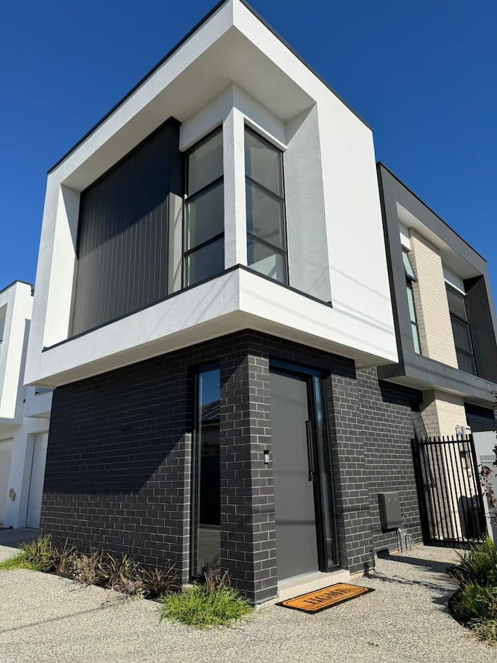 शहराच्या जवळ, ट्री लाईन असलेल्या रस्त्यावर आधुनिक घर.