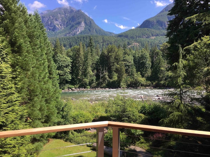 कॅस्केड माऊंटन्समधील अप्रतिम रिव्हरफ्रंट शॅले