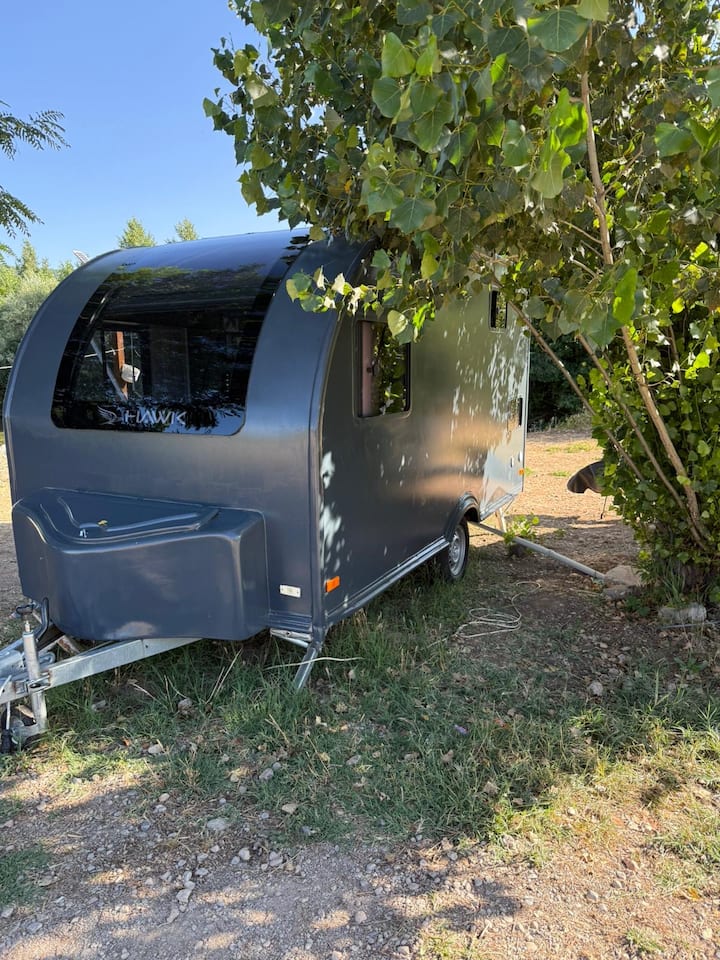 तलावाच्या दृश्यासह कॅरवान कॅम्पिंग