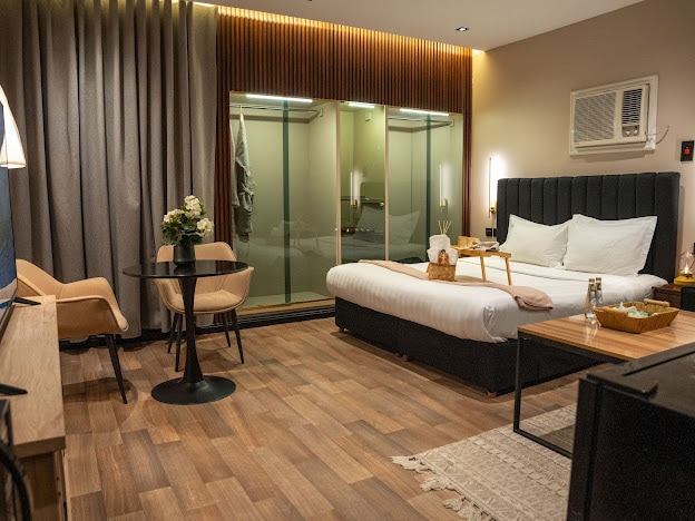 आरामदायक, आरामदायक, आरामदायक रात्रीचा आनंद घ्या. हे पैगंबरची मस्जिद आणि क्युबा मस्जिद (कारने 5 मिनिटे आणि पैगंबरांच्या मशिदीपासून 25 मिनिटे चालत, आणि क्युबा मशिदीपासून कारने 3 मिनिटे आणि 20 मिनिटे चालत ) दरम्यान आहे. जागेमध्ये जुळे बेड असलेल्या बेडरूमचे सर्व आरामदायी, 65 इंच स्क्रीन असलेले आरामदायक लाउंज, फिट केलेले किचन आणि इंटिग्रेटेड टॉयलेट आहे. वैशिष्ट्यपूर्ण विनामूल्य वायफाय. लिफ्ट. जागेच्या बाजूला विनामूल्य पार्किंग सेवा आणि रेस्टॉरंट्सची 24/7 उपलब्धता आम्ही तुम्हाला आनंददायी वास्तव्याची शुभेच्छा देतो