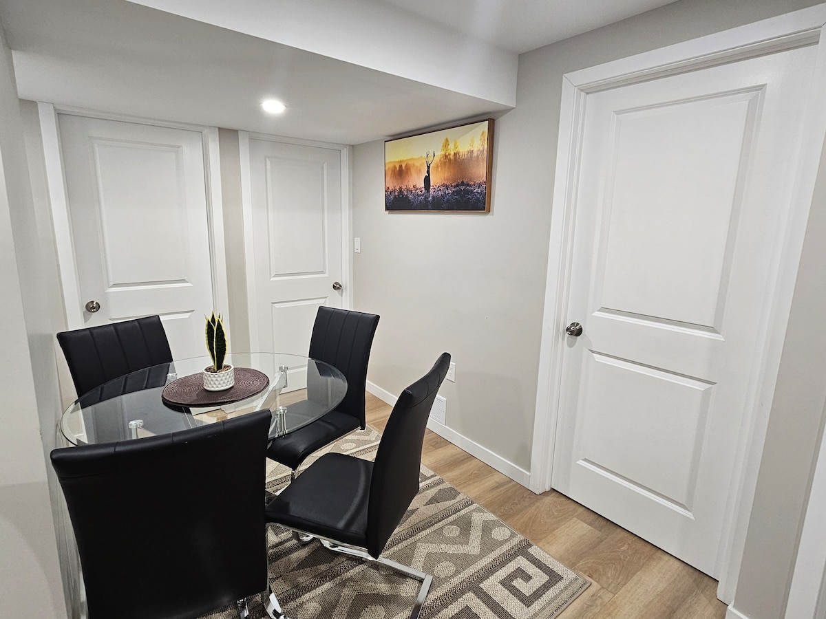 1 बेडरूमच्या तळघरातील अपार्टमेंटमध्ये एक फंक्शनल किचन आहे ज्यात कुकटॉप, फ्रिज, मायक्रोवेव्ह, केटल, कॉफी ब्रूवर, कटलरी तसेच तुमच्या वापरासाठी मूलभूत कुकिंग आणि सर्व्हिंग भांडी आहेत. रूममध्ये क्वीन बेड असलेल्या घराच्या सर्व आरामदायी वातावरणासह आहे जे परिपूर्ण झोपेसाठी उबदार आणि उबदार आहे. ताजे/स्वच्छ टॉवेल्स दिले जातात. हे फंक्शनल ट्रान्झिट बस सिस्टमसह शहराच्या शांत वातावरणात स्थित आहे. ड्राईव्हवेवर पार्किंग उपलब्ध आहे आवश्यक असल्यास, अतिरिक्त खाजगी रूम शुल्कात उपलब्ध आहे