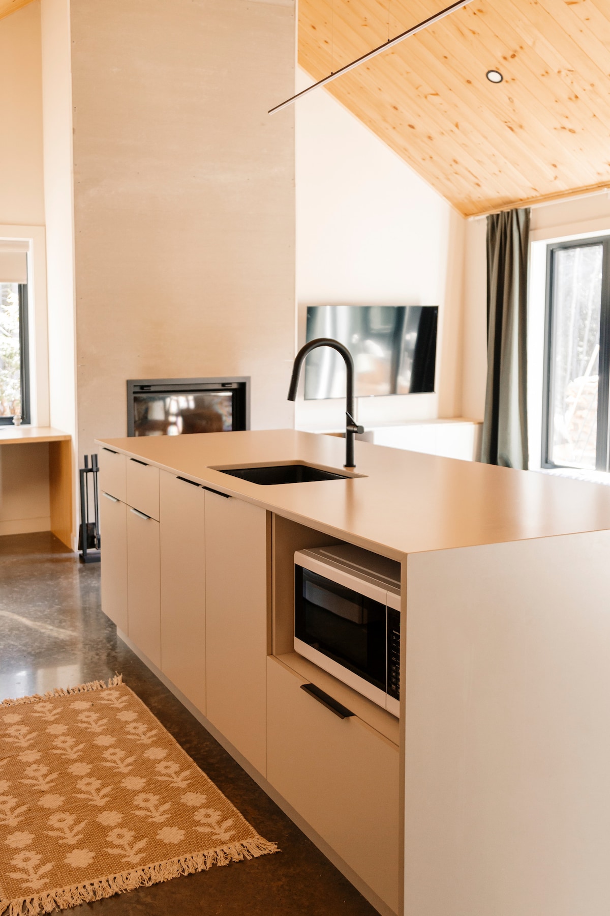 • Perfect for small families or couples, our signature A-Frame cabin features a modern interior gas burning fireplace, soaring ceilings, huge windows, stylish interiors, and all the comforts of home. • This cozy 1,100 square foot space comfortably accommodates up to four guests in two bedrooms (one with a King-size bed and the other with a Queen-size bed) and a shared bathroom. • 7 minute drive to downtown Freeport. • Proud to be ranked in the top 1% and voted Guest Favorite!