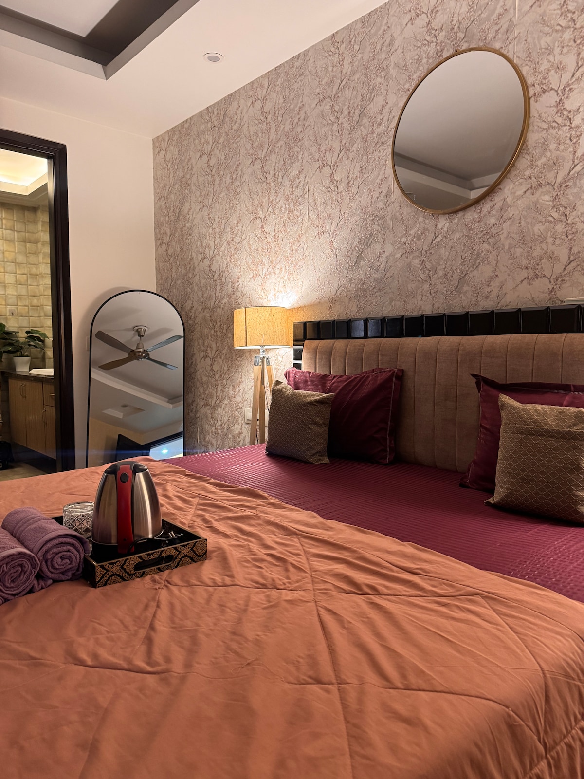 Welcome to the stylish retreat in the city! Relax with your family, friends and your love ones at one BHK apartment, self checkin and premium amenities in space, located at 10 minutes drive from Saket metro Station, 15 minutes away from select city walk, 10 minutes away from Mehrauli and 30 minutes away from IGI Airport. THIS SPACE CONTAINS:- *Double bed *Sofas with cosy feel *Air condition *Wifi *Modular kitchen with cutlery *Induction *RO *Refrigerator *TV *Pet parents are welcome:)
