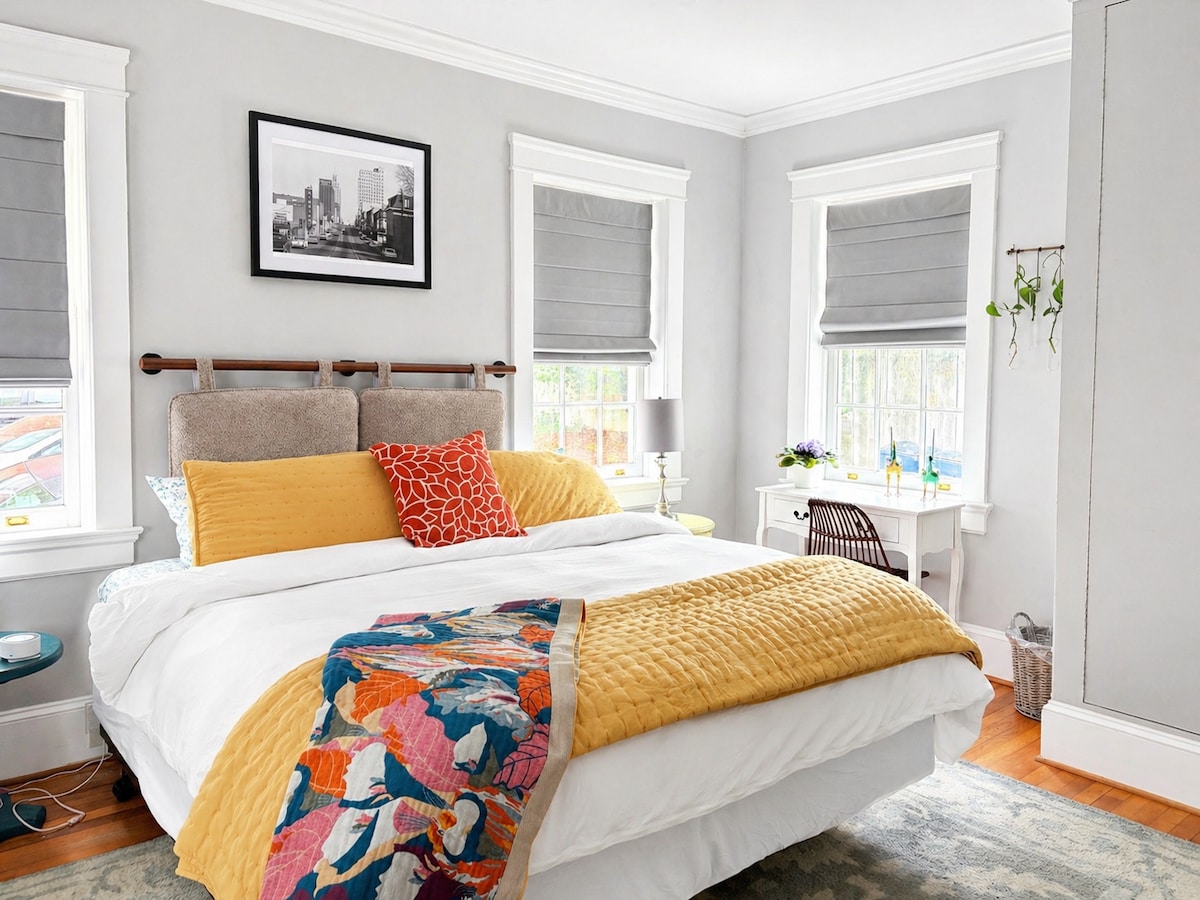 हाय पॉईंटच्या मध्यभागी असलेला ऐतिहासिक काँडो, दुसऱ्या मजल्याच्या पायऱ्या ॲक्सेस. 12 वर्षे आणि त्याहून अधिक वयाच्या मुलांचे स्वागत आहे. हाय पॉईंट युनिव्हर्सिटीपासून 1 मैल अंतरावर आहे. HPFM, बेसबॉल स्टेडियम, चिल्ड्रन्स म्युझियम, रेस्टॉरंट्स, ब्रुअरीज, जे. एच. ॲडम्स इन, ग्रीनवे, पिकलबॉल कोर्ट्स, लायब्ररी, फार्मर्स मार्केट आणि इतर अनेक गोष्टींच्या जवळ. ऐतिहासिक वृक्षांनी रेखांकित रस्त्यांवर फेरफटका मारा. ओक हॉलो लेक 5 मिनिटांच्या अंतरावर किंवा जेम्सटाउनमधील सिटी लेक पार्क. विन्स्टन सालेम/ग्रीन्सबोरो फक्त 20 मिनिटांच्या अंतरावर. एअरपोर्ट 20 मिनिटांच्या अंतरावर. ॲमट्रॅक स्टेशनवर जा.