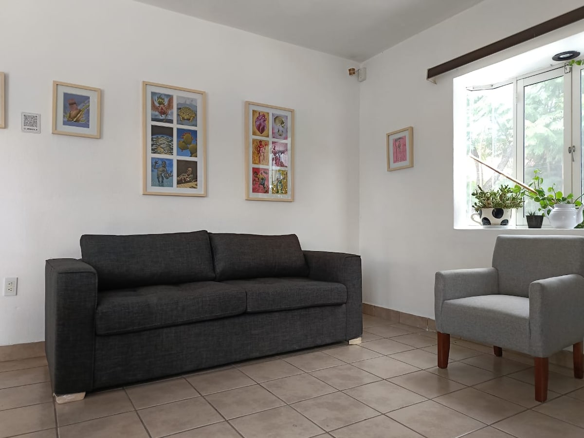 राहण्याची ही स्टाईलिश जागा ट्रिप्ससाठी योग्य आहे. 1 बेडरूम आणि 1 बाथरूमसह प्रशस्त अपार्टमेंट. 1 क्वीन बेड्स, एअर कंडिशनिंग, 1 50'1 55 'टीव्ही. ओक्साकन टचसह ब्रेकफास्ट समाविष्ट आहे. घरी असल्यासारखे वाटण्यासाठी सर्व आवश्यक ॲक्सेसरीज. स्टारलिंक हाय स्पीड इंटरनेट, दूर काम करण्यासाठी योग्य. सकाळी तुमची कॉफी पिण्यासाठी सुंदर पॅटिओ. लाँड्रीचा पर्याय (वॉशर आणि ड्रायर) किंमतीवर. दीर्घकालीन रिझर्व्हेशनसह अनेक संकुल आणि फायदे जोडले जातात. इलेक्ट्रिक कार चार्जर (अतिरिक्त किंमत)