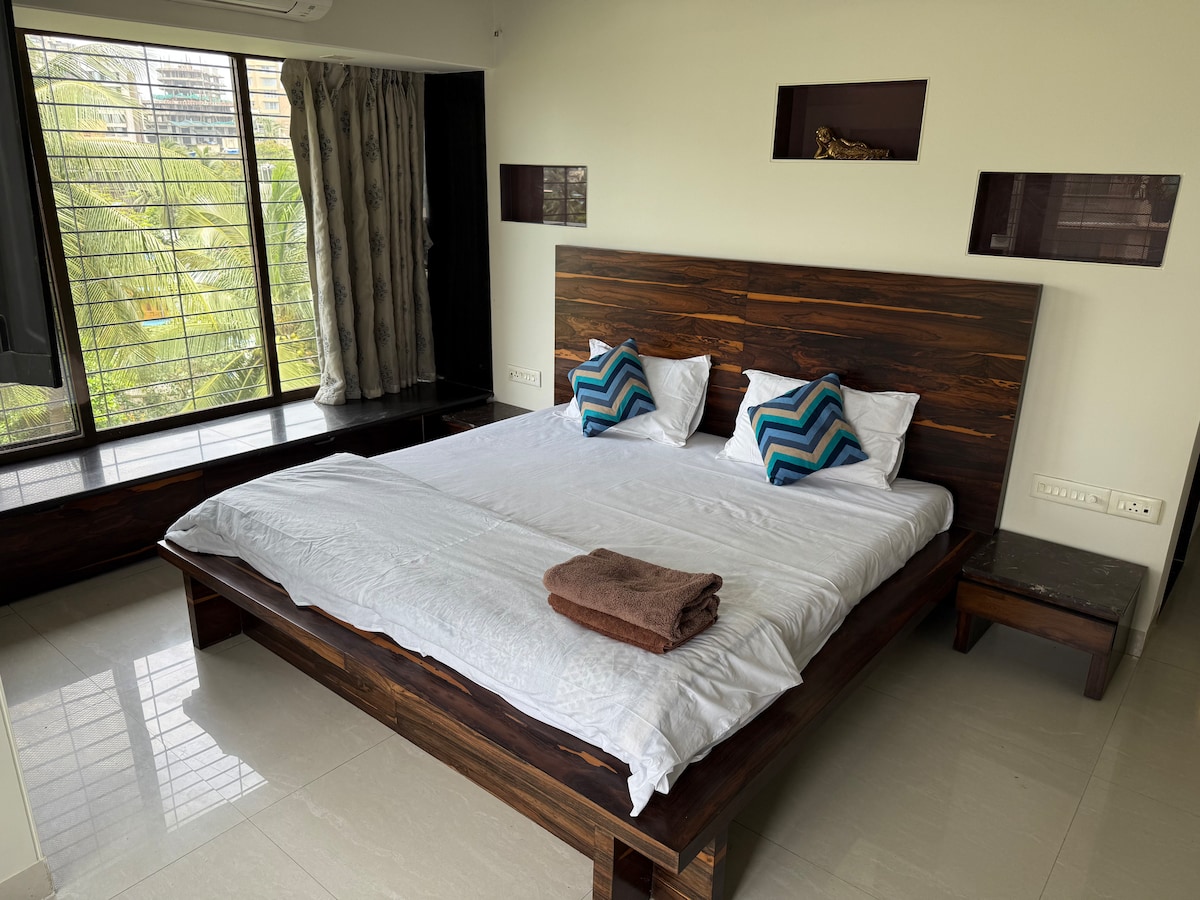 Bright & spacious 1BHK apartment with high ceilings, tall European-style windows, a fully equipped kitchen & 2 bath. Steps from FarmerтАЩs Caf├й,Linking Road, & auto-rickshaws тАФ in one of IndiaтАЩs coolest neighbourhoods. тАв 1st floor flat тАв African themed interiors тАв 1 spacious bedroom with 2 bathrooms тАв Balcony тАв Split AC in living room & bedroom тАв 43" Smart TV тАв Hi-speed Wi-Fi тАв Airport ride, meals & other services avail