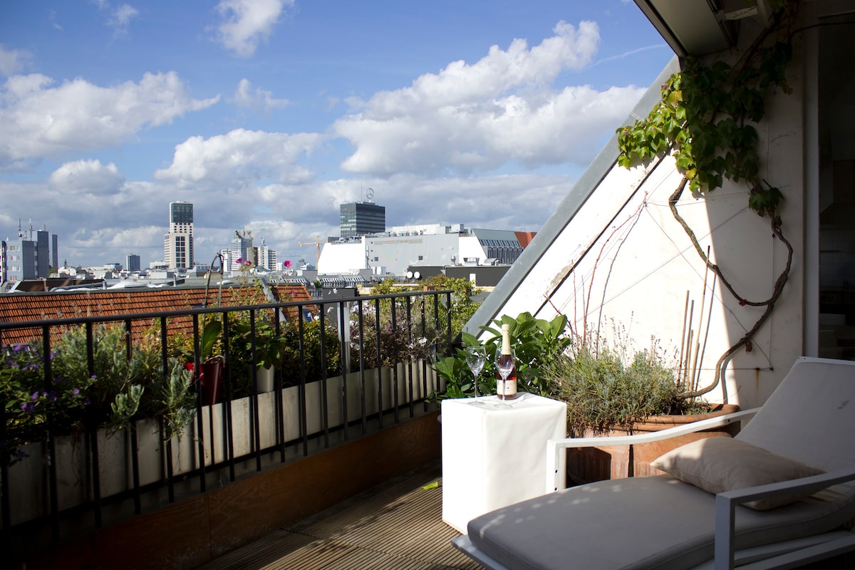 उबदार पूर्णपणे सुसज्ज किचनसह मध्यवर्ती, सूर्यप्रकाशाने भरलेले, वातानुकूलित ॲटिक अपार्टमेंट (70m ²), जिथे तुम्ही स्वादिष्ट ब्रेकफास्टसह दिवसाची सुरुवात करू शकता. आरामदायी बेड्स तुम्हाला रात्रीची चांगली झोप मिळवून देतात. अनियंत्रित दृश्यांसह 9m² हिरव्या टेरेसचा (येथे धूम्रपान करण्याची परवानगी आहे) आनंद घ्या. अपार्टमेंटपासून फार दूर नाही S - Bhan स्टेडियम ज्युलियसलेबरब्रूके जिथून तुम्हाला Potsdamer Platz + BrandenburgerTor + सरकारी जिल्ह्यापर्यंत फक्त 3 थांब्यांची आवश्यकता आहे. वायफाय