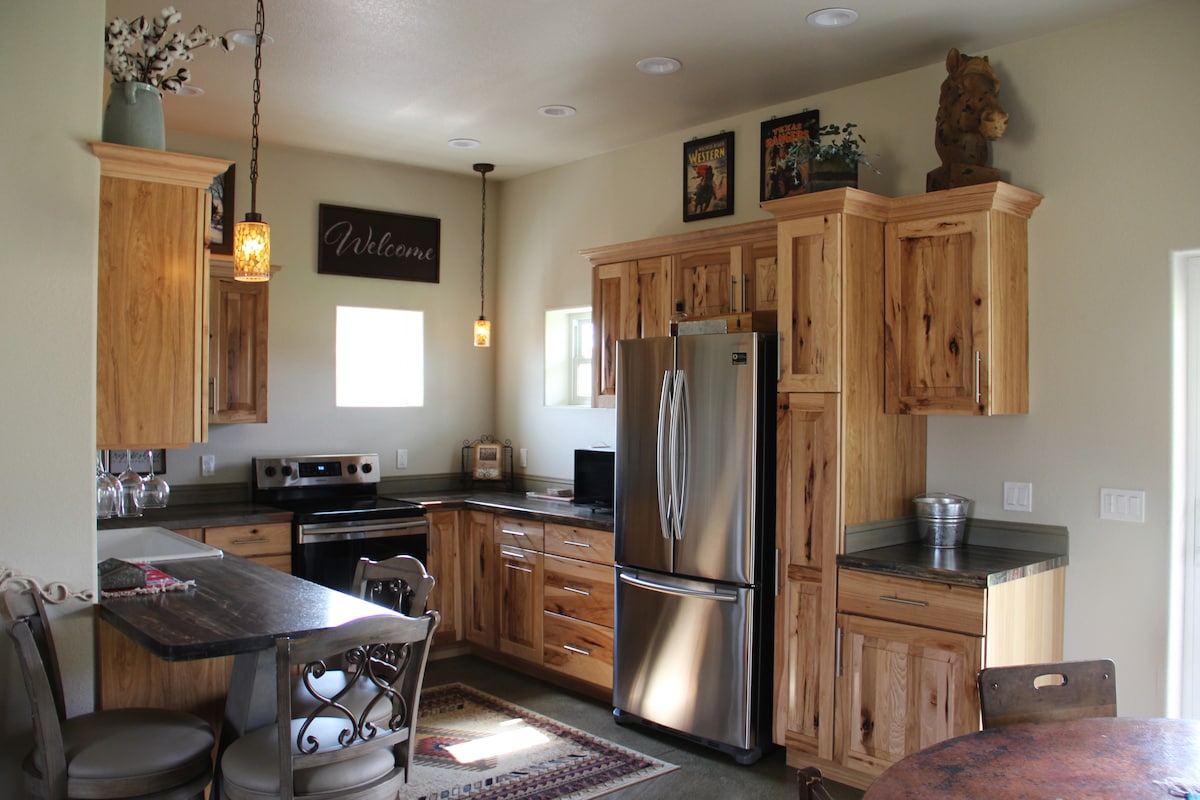 आमची रँच थिओडोर रूझवेल्ट नॅशनल पार्क, मेडोरा, मेडोरा म्युझिकल, माह दाह हाय ट्रेल आणि रेस्टॉरंट्सच्या जवळ आहे. तुम्हाला मेडोरा मिळेल त्यापेक्षा आम्ही एक वेगळा अनुभव ऑफर करतो. रँच हे शांततेत रिट्रीट आहे आणि शहरापासून 8 मैलांच्या अंतरावर आहे. गेस्ट्स आम्हाला नियमितपणे सांगतात की रँच नॅशनल पार्कला निसर्गरम्य दृश्यांसाठी प्रतिस्पर्धी आहे आणि ते त्यांच्या दाराबाहेर आहे. अतिरिक्त बोनस, शहराकडे जाणारी ड्राइव्ह अप्रतिम आहे. तुम्हाला वायफायची आवश्यकता असल्यास, आमच्या गॅरेजमध्ये आमच्या गेस्ट लाउंजमध्ये विनामूल्य वायफाय आहे.