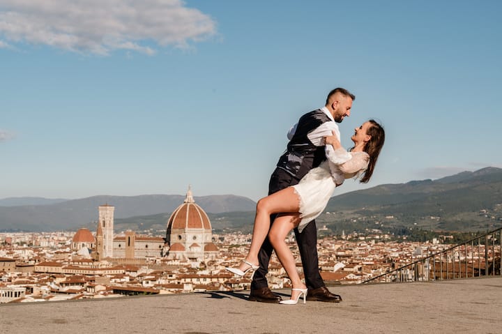 फ्लोरेन्सच्या दृश्यासह, अविस्मरणीय फोटोंसाठी पार्श्वभूमी म्हणून काम करणाऱ्या पियाझले मायकेलॅंजेलो येथे एक सत्र.