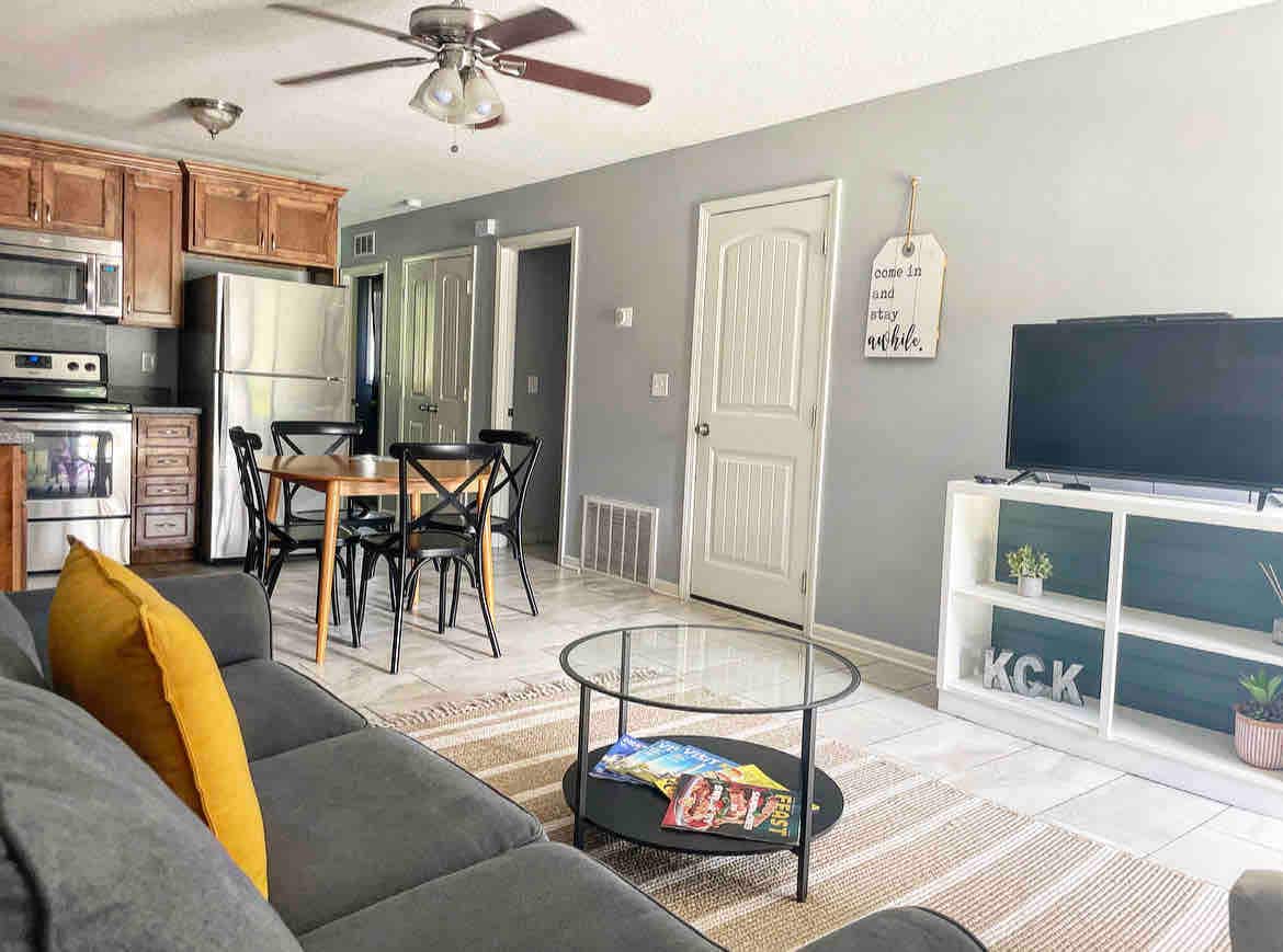 Welcome to our newly remodeled, fun, Kansas City themed, ranch layout townhome! Featuring 2 bedrooms, 1 bathroom and a TV/Game den with comfortable couch that can convert to a queen size bed. Fully equipped kitchen, washer/dryer, Smart TV's, WiFi with streaming capabilities, Infinity Game Table with multiple games to choose from, outdoor grill and patio set, tennis/basketball court in the neighborhood (equipt. in the shed) and 4 shared pools, available seasonally. Safe location, 5 min from I-35.
