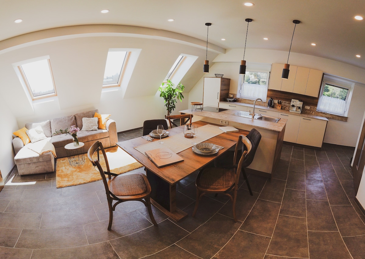 व्होलकरमार्कच्या जुन्या शहरातील मध्ययुगीन घरात छप्पर, मुख्य चौरस आणि हिरव्या अंगणातील दृश्यांसह अपार्टमेंट दुसऱ्या मजल्यावर आहे. जुन्या भिंती आणि सुंदर लाकडी घटक प्रेमळपणे पूर्ववत केले गेले आहेत. ऐतिहासिक चारित्र्याचे जतन करण्यासाठी, आम्ही नैसर्गिक बिल्डिंग मटेरियल वापरले. वॉल्टेड छत आणि रोमँटिक लाकडी पायऱ्या विशेष आहेत. कमी दरवाजे तसेच असमान भिंती आणि फरशी अपार्टमेंटला विशेष आकर्षण देतात.