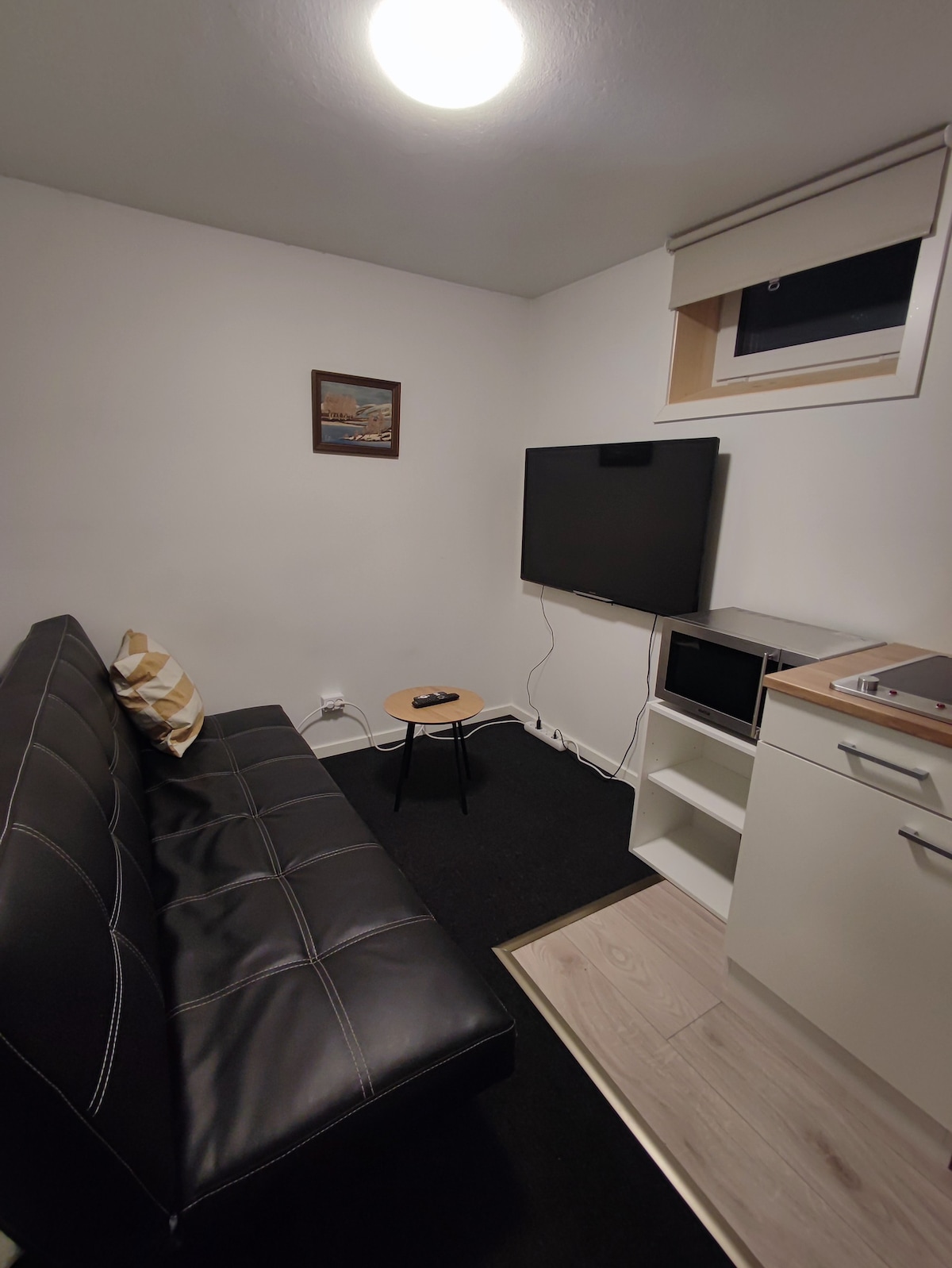 Liten källarlägenhet i lugnt område. I lägenheten finns en 105cm säng och en mindre bäddsoffa som också blir 105cm nedfälld. Sängkläder och handdukar finns i lägenheten. Lägenheten ligger ca 3-4 minuter med bil från E4an. Centrala stan ligger 1.3 km bort.