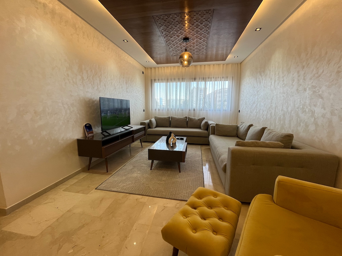 Le logement se situe dans le luxueux quartier de Prestigia à 600 m du Grand stade de Rabat (CAN2025). Elégant et très lumineux, l'appartement dispose d'un salon moderne avec 2 chambres, dont une suite parentale avec une salle de bain (baignoire) et d'une 2ème chambre avec deux lits simples. Il dispose également d'une 2ème salle de bain avec une douche à l'italienne et d'une cuisine entièrement équipée. L'appartement offre une jolie terasse avec une belle vue et sans vis-à-vis.