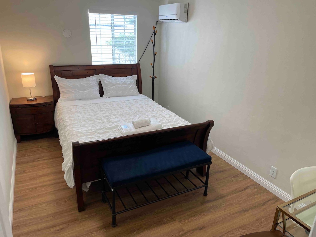 Welcome to our brand new private studio. This little cozy studio is perfect for a solo traveler, with private entrance, kitchenette and sparkling clean bathroom. New 55'' 4K smart TV, new kitchen appliance, new furniture, everything in this little gem is new. The space is for a single guest and furnished with a high quality queen size bed, night stand, dining table, clothes rack and full size mirror. Free & gated parking/ 24/7 access to free laundry. Super good deal! Don't miss out!