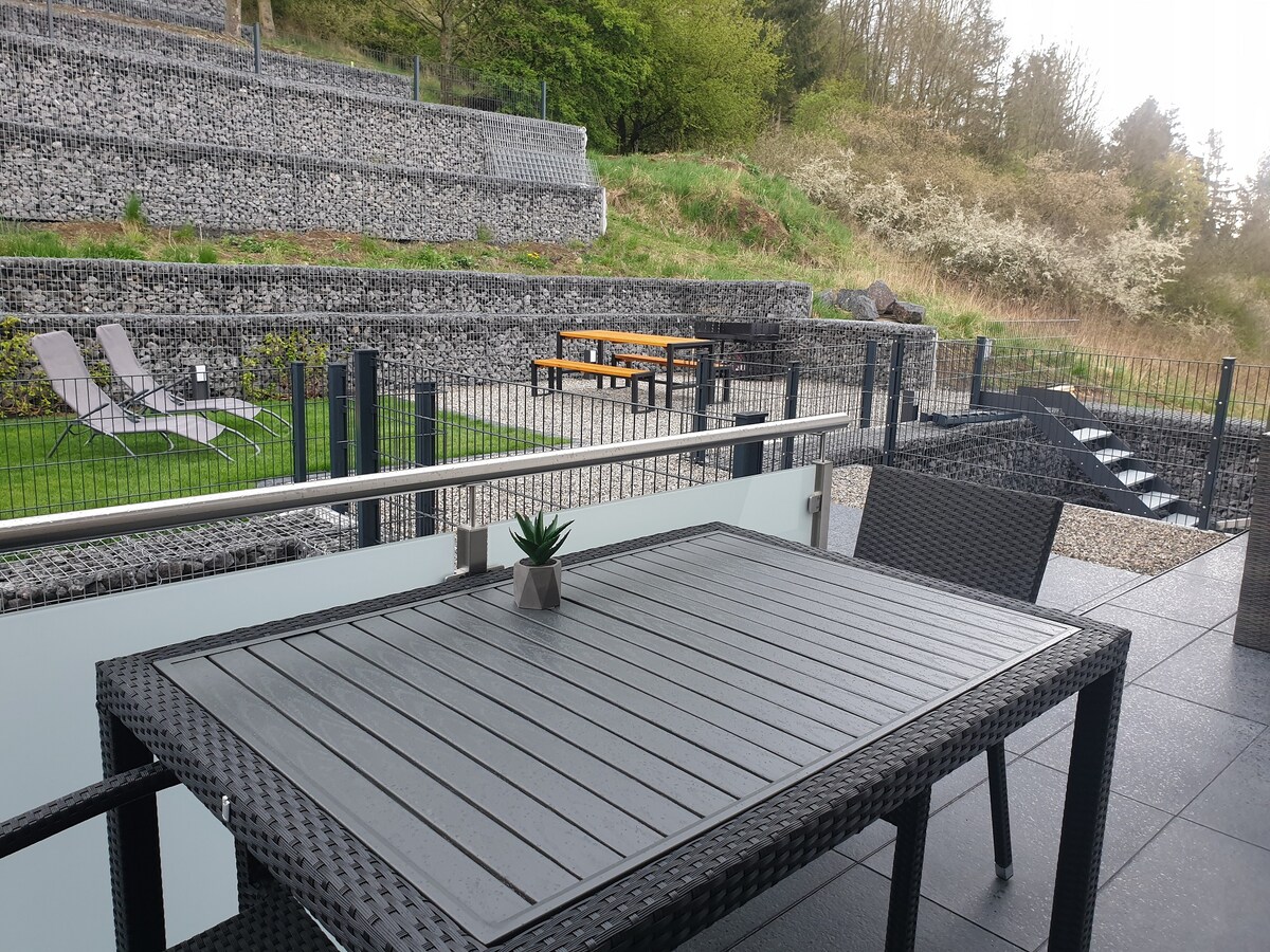LuxApart Vista हे आयफेलमधील तुमचे लक्झरी हॉलिडे होम आहे, ज्यात पॅनोरॅमिक आउटडोर सौना आहे – जोडप्यांसाठी, कुटुंबांसाठी आणि मित्रांसाठी योग्य. आयफेलच्या जंगलांच्या चित्तवेधक दृश्यासह 135 चौरस मीटर आरामाचा आनंद घ्या. दोन शांत बेडरूम्स, बेटासह आधुनिक किचन आणि 70 चौरस मीटर टेरेसचा ॲक्सेस, तसेच स्मार्ट टीव्ही आणि फायरप्लेससह एक उबदार लिव्हिंग रूम. आऊटडोअर सॉनामध्ये आराम करा आणि परिपूर्ण गेटअवेचा अनुभव घ्या – मग ते जोडपे म्हणून रोमँटिक असो, कुटुंबासह असो किंवा मित्रमैत्रिणींसह असो.
