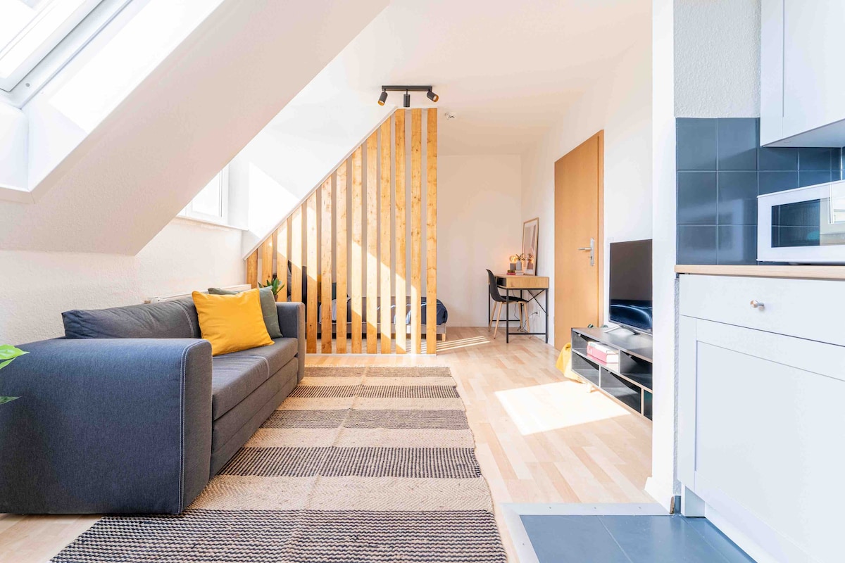 Equipped with a complete kitchen, comfortable bed (queen) and convertible sleeping sofa (double), a spacious bath and terrace, the studio invites you to spend lovely days in central Cottbus. It is ideal for two persons or a couple with baby or toddler . We have special provisions for kids on request such as cot or high chair.