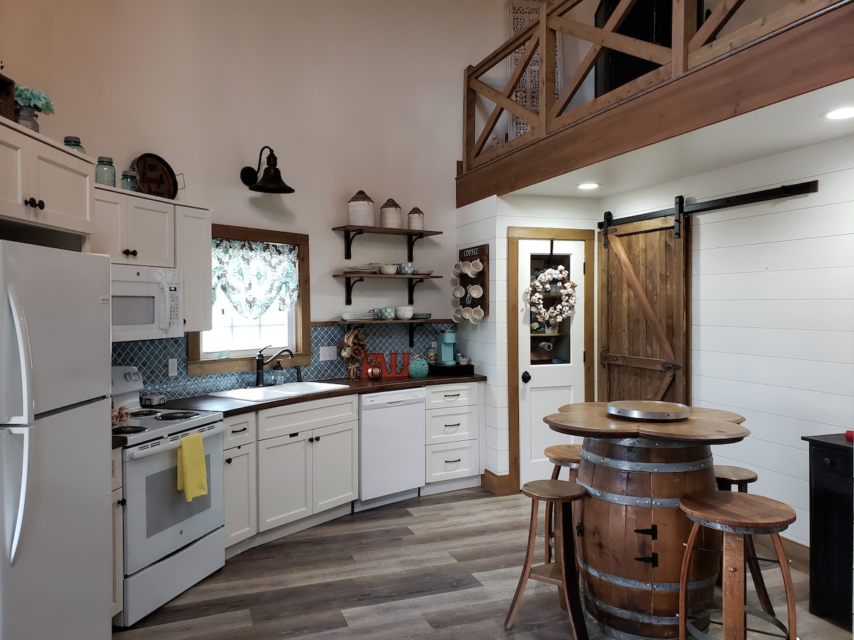 या ट्रीहाऊसमध्ये एक भव्य मजल्यापासून छतापर्यंत दगडी इनडोअर/आऊटडोअर फायरप्लेस, वॉल्टेड सीलिंग आणि नैसर्गिक प्रकाश आणि सुंदर दृश्ये प्रदान करणाऱ्या अनेक मोठ्या खिडक्या आहेत. इंटिरियर डिझाइन लाकूड आणि दगडी नैसर्गिक घटकांना जोडते, अधिक परिष्कृत आणि पॉलिश केलेल्या शहरी देशाचा देखावा. विभाजनाची भिंत या मोठ्या (950 चौरस फूट) ओपन फ्लोअर प्लॅनमध्ये जिव्हाळ्याच्या जागा तयार करते. हायलाइट्स: किंग साईझ बेड, कॉर्नर क्लॉ टब, शॉवर शॉवर, रीडिंग एरिया, 65" टीव्ही, मोठा डेक आणि बार्बेक्यू ग्रिल.