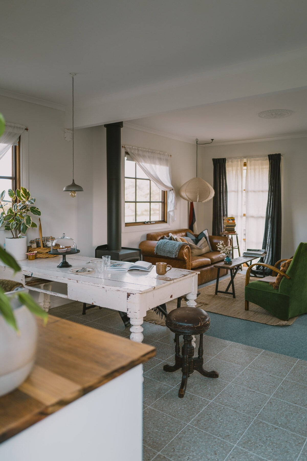 The cabin sits quietly among the vines on our working vineyard at Blame Mabel. Step outside and wander among the rows, a place to breathe, slow down, and enjoy the stillness of the country and sky. The sunlit kitchen waits for cooking at your own pace, the fire flickers in cooler months, and the bedroom wakes gently with the morning light. There’s no television. Nights are still. It’s the kind of stay you book when you need to disappear for a while. Mabel may wander by to say hello.