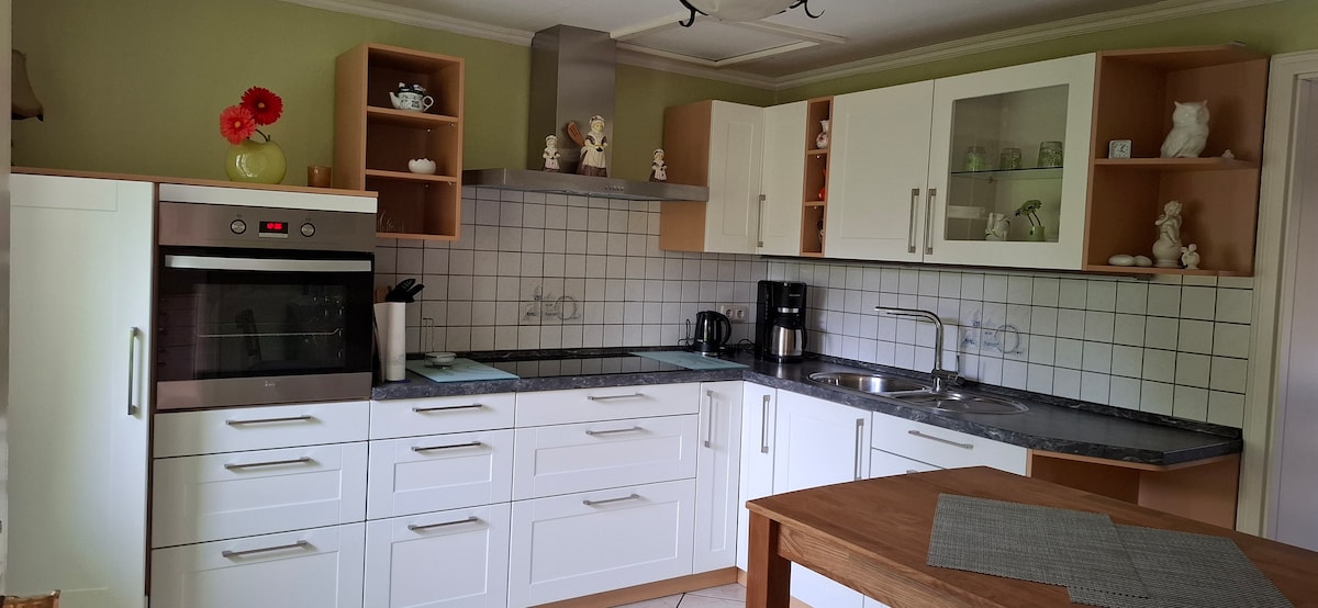 लहान छोटी झाकलेली फ्रिसेनहौस, प्रेमळपणे सुसज्ज आणि 32 चौरस मीटर राहण्याची जागा असलेल्या भव्य कूल - डी - सॅक लोकेशनमध्ये. 5 मिनिटांत मोठ्या सार्वजनिक आंघोळीच्या जागेसह तलाव. किंचित मोठी मुले असलेल्या सिंगल्स, जोडप्यांसाठी आणि कुटुंबांसाठी आदर्श (पायऱ्या ऐवजी उंच आणि मुलांचे आश्रयस्थान उपलब्ध नाही). समोरच्या दाराबाहेर पार्किंगची जागा. आवश्यक असल्यास आणि सल्लामसलत करून गार्डन तसेच मोठी सूर्यप्रकाश टेरेस देखील वापरली जाऊ शकते. खरेदी 3 किमी अंतरावर आहे.