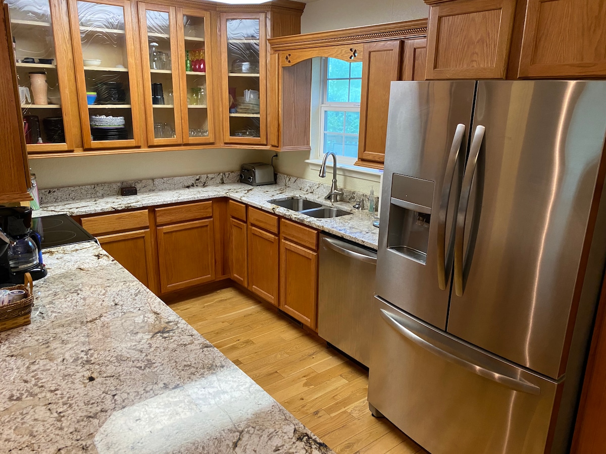 कारलाचे कॉटेज हे आराम आणि पुनरुज्जीवन करण्यासाठी एक उत्तम ठिकाण आहे. दोन क्वीन बेड्स आणि एक पूर्ण बेड यामुळे झोपणे सोपे होते. किचन जेवण तयार करण्यासाठी पूर्णपणे सुसज्ज आहे. प्रॉपर्टीवर पूर्ण आकाराचे वॉशर आणि ड्रायर उपलब्ध आहेत. मोठ्या डेकसह प्रोपेन ग्रिल खाणे, भेट देणे, वाचणे किंवा फक्त वातावरणाचा आनंद घेण्यासाठी सर्व काही योग्य बनवते. वॉलमार्ट 3.3 मिलियन, सिल्व्हर डॉलर सिटी 7.6 मिलियन, टेबल रॉक लेक 10 मिलियन, साईट अँड साउंड थिएटर 13 मिलियन, ब्रॅन्सन लँडिंग 18 मिलियन, डॉगवुड कॅन्यन 20 मिलियन आहे.