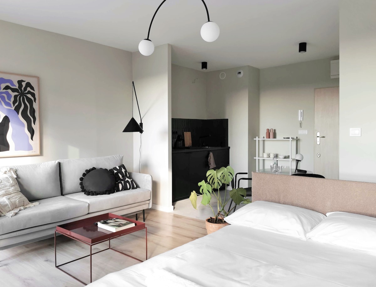 लॉड्जच्या मध्यभागी राहण्यासाठी आदर्श असलेला स्टाईलिश स्टुडिओ अपार्टमेंट. प्रसिद्ध लॉड्ज पादचारी मार्ग - पियोट्रोकोव्स्का स्ट्रीटपासून 1 किमी अंतरावर. की सेफच्या मदतीने चेक इन आणि चेक आउट सोप्या, स्वतंत्र आणि जलद पद्धतीने केले जाते. पाहुण्यांसाठी एक फोल्डिंग सोफा आणि एक बेडरूमचा मधला मजला उपलब्ध आहे. अपार्टमेंट लॉड्जच्या पुनरुज्जीवित टेनमेंट हाऊसच्या मागील इमारतीत स्थित आहे. यामध्ये संपूर्णपणे सुसज्ज स्वयंपाकघर आणि सर्व आवश्यक स्वच्छता उत्पादने आणि सुविधा आहेत.