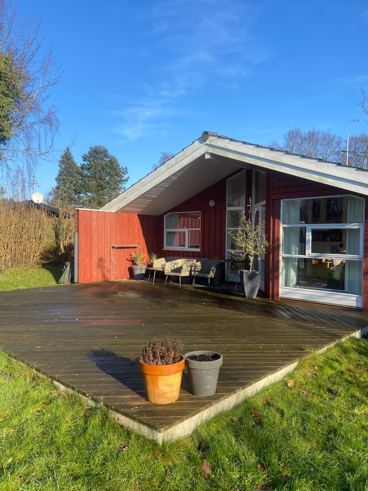 आमचे उबदार लाकडी केबिन परिपूर्ण गेटअवे आहे! मुख्य घरात लिव्हिंग रूम, डायनिंग एरिया आणि किचन आहे, ज्यामध्ये दोनसाठी सोफा बेड आहे. स्लीपिंग हाऊसमध्ये स्वतःचे प्रवेशद्वार असलेले डबल बेड आहे आणि बाथहाऊस शांतता आणि विश्रांतीसाठी वॉक - इन शॉवर देते. किचनमधून तुम्ही एका मोठ्या लाकडी टेरेसवर जाता – मॉर्निंग कॉफी आणि डिनरसाठी योग्य. उन्हाळ्यात बीच/पाणी आणि सांप्रदायिक स्विमिंग पूलपर्यंत 4 मिनिटे चालत जा. Chromecast, शॅम्पू, कंडिशनर आणि कॉफी मेकर यासारखी पुस्तके आणि आवश्यक गोष्टी. कृपया तुमचे स्वतःचे बेड लिनन आणि टॉवेल्स आणा.