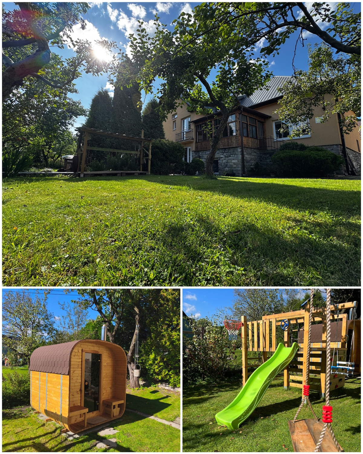 मूळ टाईल्ड स्टोव्हसह – जुन्या काळातील वातावरण असलेल्या प्रशस्त कॉटेजमध्ये 27 लोकांपर्यंत आरामदायी वास्तव्याचा आनंद घ्या. कुटुंबांसाठी आणि मोठ्या ग्रुप्ससाठी उत्तम. वेलनेस बाथिंग बॅरल आणि सॉना. मुलांचे खेळाचे मैदान आतील आणि बाहेरील खेळाचे मैदान. संध्याकाळच्या सीटसाठी फायर पिट आणि ग्रिल. कुंपण घातलेल्या प्रॉपर्टीच्या अगदी मागे क्रीक. आसपासचा परिसर समृद्ध संधी प्रदान करतो - हायकिंग, बाइकिंग ट्रेल्स, स्कीइंग, ढगांमध्ये एक ट्रेल आणि करमणूक पार्क्स. आराम करा, रिचार्ज करा आणि निसर्गाच्या हृदयात शेअर केलेले अनुभव तयार करा.