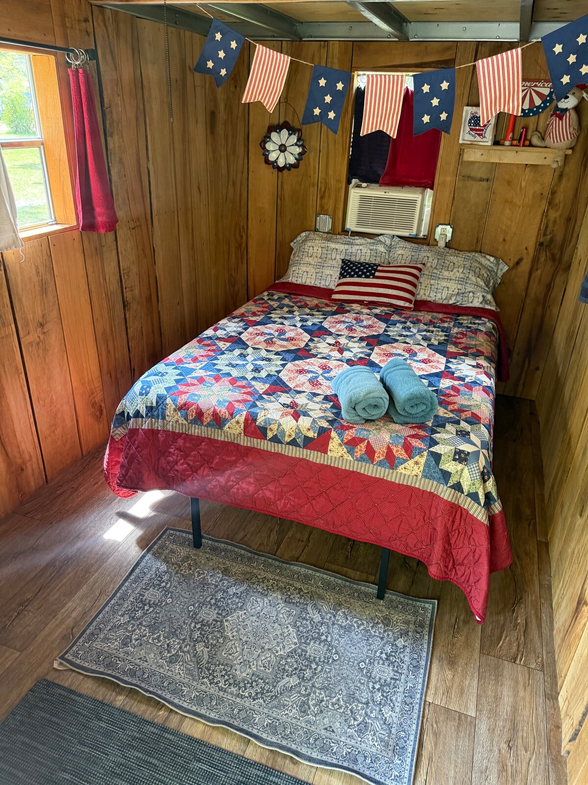 ही सुंदर केबिन साध्या ग्लॅम्पिंगसाठी योग्य आहे. हे स्थानिक वास्तविक हार्डवुडपासून बांधलेले होते. फ्रीज/मायक्रोवेव्हसह सुपर क्लीन बाथरूम्स आणि लहान कम्युनिटी गझबो अगदी थोड्या अंतरावर आहे. (3 पैकी 1 केबिन्स आमच्याकडे आहेत जे दोन गेस्ट्स झोपतात) तुमच्या बॅक पोर्चमधून बाहेर पडल्यावर तुम्हाला एक फायर पिट आणि पिकनिक टेबल मिळेल. सोयीस्कर चेक इनसाठी कीलेस एन्ट्री. तुमच्या पोर्चच्या अगदी जवळ असलेल्या खाजगी फायर पिटवर s'ores चा आनंद घ्या आणि भव्य स्टारने भरलेल्या आकाशाकडे पहा.