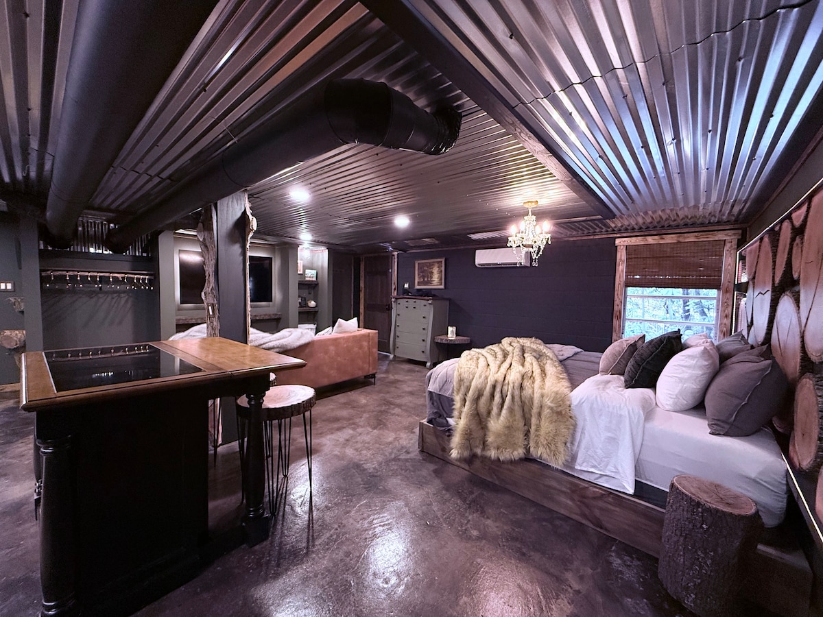 क्रीकसाईड बरोमध्ये तुमचे स्वागत आहे, निसर्गामध्ये असलेले माझे खास डिझाइन केलेले गेस्ट हाऊस. प्रत्येक तपशील तुमच्या आनंदासाठी आणि विस्मयासाठी डिझाइन केला आहे—स्थानिकरित्या मिळवलेल्या झाडांपासून बनवलेले लाईव्ह एज रेड ओक हेडबोर्ड, चमकणाऱ्या दिव्यांसह रेन शॉवर हेड, ट्री-हाऊस स्टाईल किचन आणि समोरच्या दाराबाहेर फायरपिटसह एक खाजगी पोर्च.एका शांत छोट्या खाडीवर वसलेले, तुम्ही हळूवारपणे वाहणाऱ्या पाण्याच्या आवाजात झोपी जाऊ शकता. तुमच्या सोयीसाठी नवीन एसी/हीटिंग. जलद वायफाय. 65” बॅकलिट स्मार्ट टीव्ही. आणि बरेच काही!