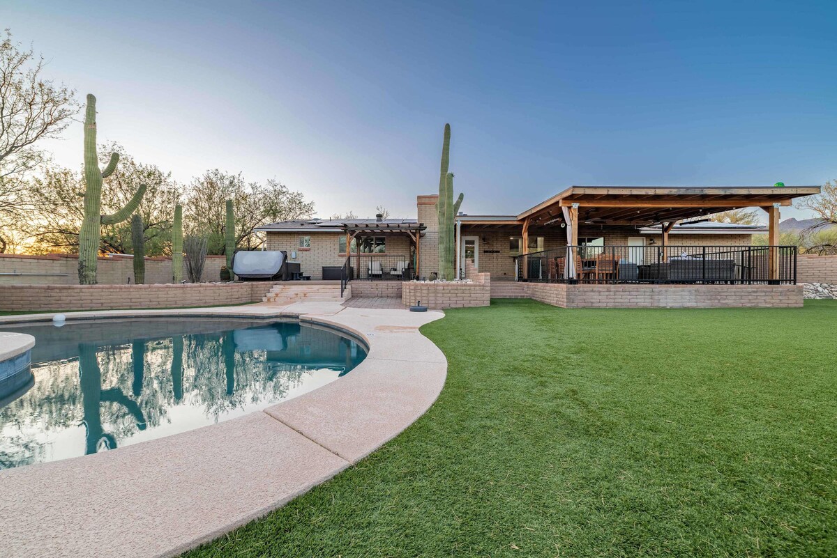 टक्सनच्या हिरव्यागार टँक व्हर्डे व्हॅलीमधील आमच्या कुटुंबाच्या खाजगी रिसॉर्टमध्ये आराम करा. आजूबाजूच्या सर्वोत्तम हायकिंग आणि बाइकिंगच्या जवळ, पायथ्याशी वसलेले रेस्टॉरंट्स आणि शॉपिंगचे मिनिट्स. आमचे अपस्केल घर एक एकर+ जमिनीवर आहे, हिरव्यागार झाडांसह आणि उंच सागरोससह. टक्सन हेसिएन्डा मोहकता कायम ठेवत, उबदार आणि आधुनिक तपशीलांसह त्याचे नूतनीकरण केले गेले आहे. पूर्ण किचन, अपडेट केलेली उपकरणे, स्पा/जकूझी आणि स्पार्कलिंग पूल (पूल हीट अतिरिक्त), प्रोपेन ग्रिल, कॅबाना आणि फायरपिट. स्लीप्स 9