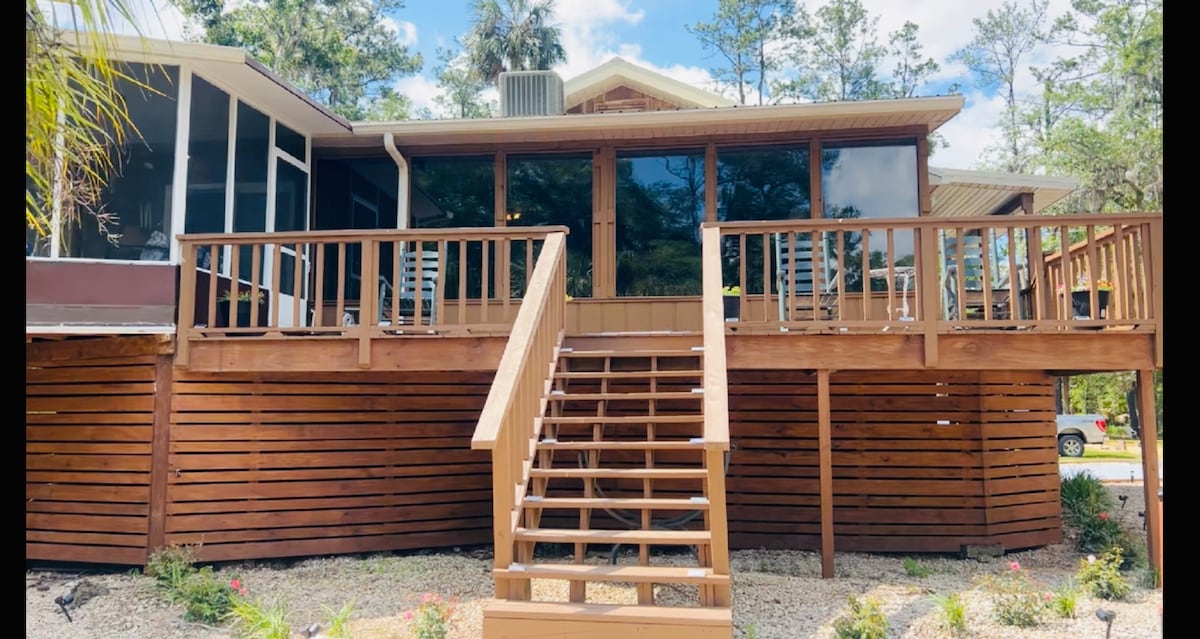 We have done some updating!! ЁЯШК one of a kind River Getaway sits on a island where Manatees and Otters are Frequently seen. You can cast your line and catch fresh water fish from the dock or river banks. You can slide the canoes or kayaks in. Just minutes away from the Gulf of Mexico for scalloping and salt water fishing. There is a fire pit and a large yard for fun family games. Downstairs offers a grill , and a screened in picnic area .