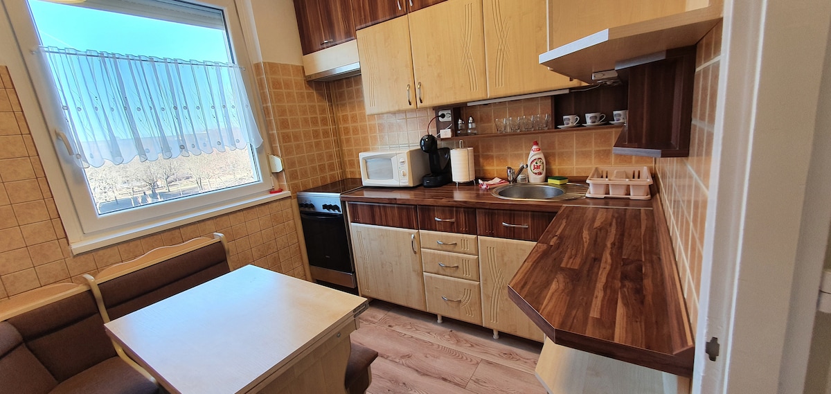 डेब्रेसेनच्या मध्यभागी, पियाक स्ट्रीटपासून काही मिनिटांच्या अंतरावर. पूर्णपणे नूतनीकरण केलेले, वातानुकूलित, यंत्रसाधित अपार्टमेंट. बंद अंगणात पार्किंगची सुविधा आहे. आम्ही हंगेरियन आणि इंग्रजीमध्ये संवाद साधतो. विमानतळ गाडीने 12 मिनिटांच्या अंतरावर आहे. जवळपास तुम्हाला किराणा दुकान, स्विमिंग पूल, टेरेससह रेस्टॉरंट मिळेल. हंगेरियन पर्यटन गुणवत्ता प्रमाणन मंडळाने आमच्या आनंदासाठी अपार्टमेंटला तीन स्टार रेटिंग दिले आहे, ही खरोखरच एक मोठी प्रशंसा आहे, तुम्हाला रेटिंगचा फोटो चित्रांमध्ये सापडेल.