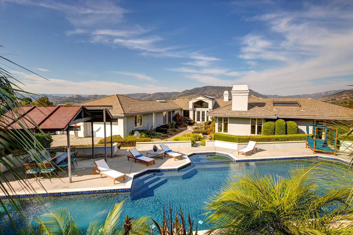 Up in the clouds on its own private 5 acre hilltop located in the countryside amidst rolling hills & hundred year old oak trees. BEST VIEWS in the area from every room of this stunning villa. Accommodating 10 guests comfortably, with space for up to 18. Featuring 2 bdrms downstairs, 2 bdrms & a loft upstairs, & 3 luxurious bthrms. Near HIKING TRAILS & renowned TEMECULA WINERIES. Surrounded by NATURE, yet close to restaurants/stores. Offering a blend of nature & convenience with fresh ocean air.