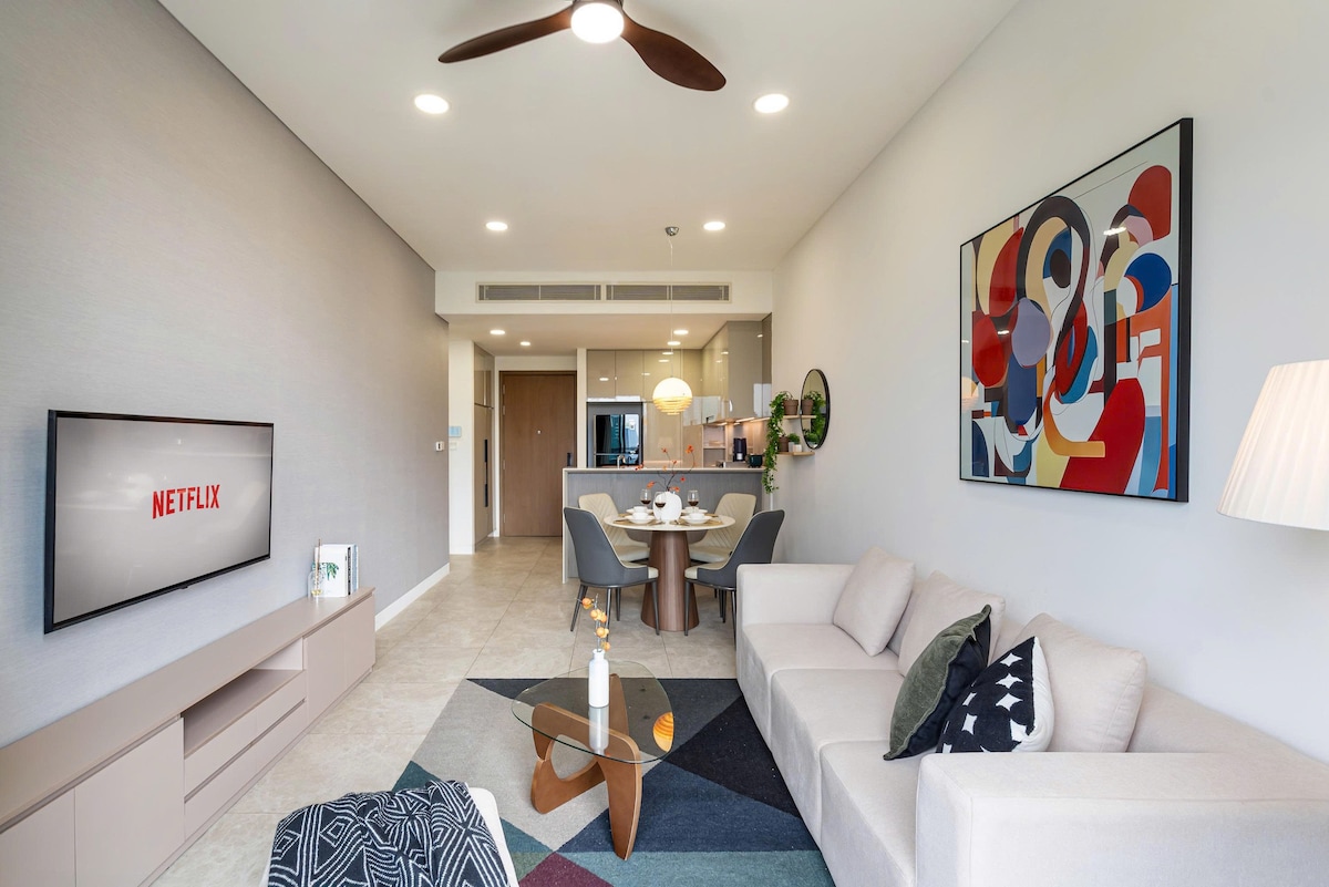 🌟 Quan2 Thao Dien मध्ये स्थित, आमच्या अपार्टमेंटमध्ये एक आधुनिक आणि स्टाईलिश डिझाइन आहे, जे आरामात एक परिपूर्ण आरामदायक जागा ऑफर करते. 🏡 प्रॉपर्टीची विशेष आकर्षणे • प्रशस्त आणि उबदार जागा: 2 बेडरूम्स आणि 2 बाथरूम्स आहेत, त्यामुळे तुम्ही तुमच्या कुटुंब आणि मित्रमैत्रिणींसह आरामात आणि आरामात राहू शकता. • पूर्णपणे सुसज्ज किचन: सर्व आवश्यक कुकिंग भांडी वापरून, तुम्ही स्वतः स्वयंपाक करू शकता आणि आणखी विशेष जेवणाचा आनंद घेऊ शकता. • नवीन सुविधा: तुमचे वास्तव्य अधिक सोयीस्कर आणि आनंददायक करण्यासाठी एअर कंडिशनिंग, वायफाय, वॉशिंग मशीन इ. सह पूर्णपणे सुसज्ज. • तुम्ही 7 पेक्षा जास्त रात्री राहिल्यास, आम्ही बेडिंग्ज आणि टॉवेल्स बदलू. 🌆 जवळपासची कमर्शियल क्षेत्रे • विनकॉम मेगा मॉल अगदी शेजारी आहे, खरेदी आणि जेवणासाठी सोयीस्कर! स्टारबक्स, मॅकडॉनल्ड्स, के - मार्केट, विन्मार्ट आणि इतर अनेक ब्रँड्स आणि रेस्टॉरंट्स तुम्हाला आवश्यक असलेल्या सर्व गोष्टी ॲक्सेस करणे सोपे करतात.