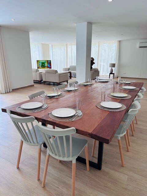 आम्ही तलावापासून फक्त 500 मीटर आणि समुद्रापासून 1.5 किमी अंतरावर आहोत. जॅकुझी, गार्डन, बार, टेरेस आणि पेटॅन्कसह 20-मीटर पूलचा विशेष ॲक्सेस मिळवा. मुख्य व्हिलामध्ये स्वतंत्र बाथरूम्ससह 7 बेडरूम्स, टीव्ही, एअरकॉन, सीलिंग फॅन्स, टीव्ही, वायफाय, किचन आणि डायनिंग आहे. लागून असलेल्या व्हिलामध्ये 1 बेडरूम, किचन आणि टेरेस आहे. 20 पर्यंत गेस्ट्सना फिट करण्याची विनंती केल्यावर फोल्ड करण्यायोग्य बेड्स दिले जातात. आमचे ऑनसाईट व्यवस्थापक आणि कर्मचारी क्रियाकलाप, अन्न आणि वाहतुकीच्या नियोजनासह तुमच्या सर्व गरजांसाठी उपलब्ध आहेत.
