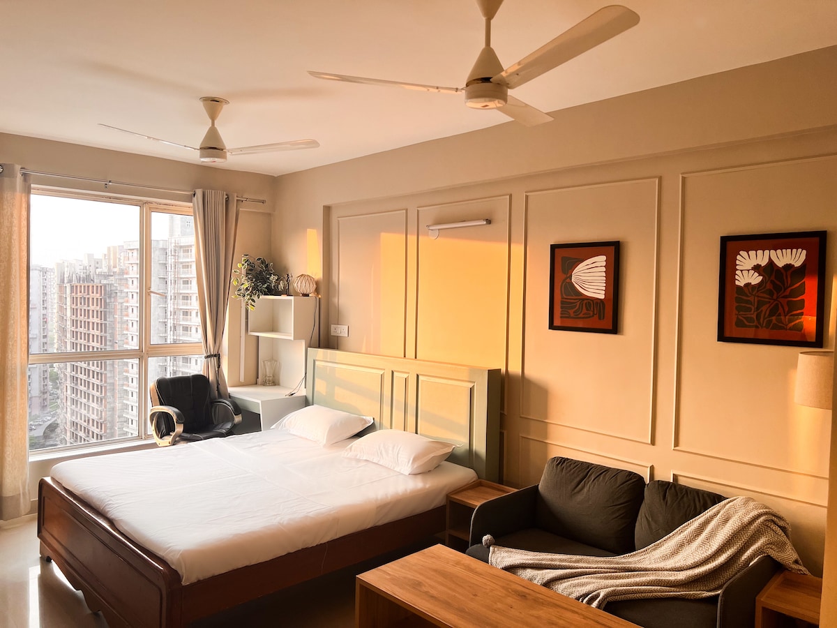 Good Monthly stay discounts available. Kick back and relax in our elegant & fully furnished studio. The earthy interiors will calm you like a boutique hotel experience. A combined charm of English design elements and luxury that offers comfort and style in every corner. We've designed this space with the same care and attention to detail as we were to live here ourselves, prioritizing comfort, style, and authenticity. Top floor | Fast WIFI | Private Balcony | Heart of Noida