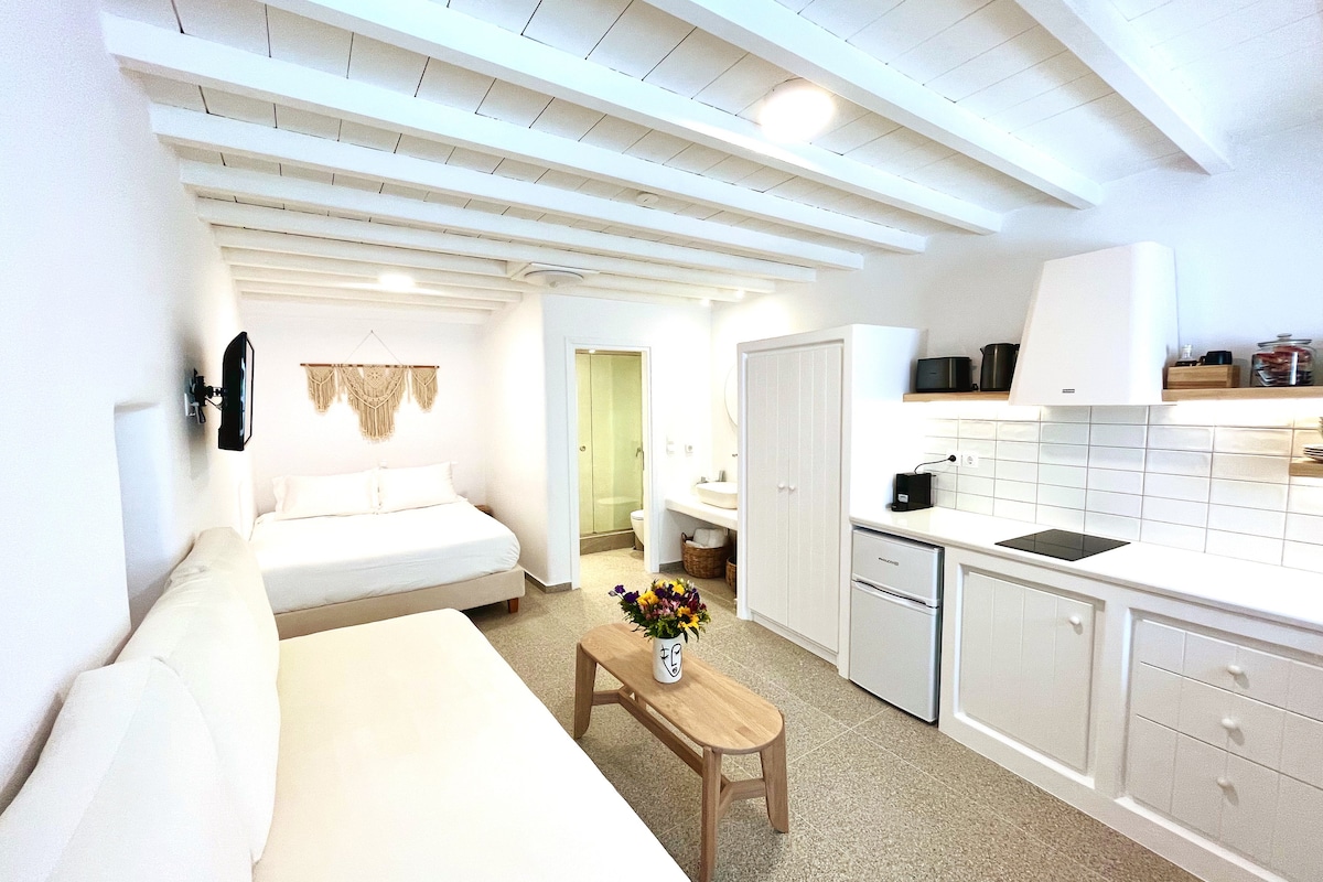 सर्व आवश्यक सुविधांसह आणि शक्य तितक्या चांगल्या लोकेशनवर स्टुडिओ अपार्टमेंट! मिकनोस शहराचे हृदय पण शांत गल्लीत! सर्व प्रमुख आकर्षणे (पवनचक्क्या, लहान व्हेनिस, ओल्ड पोर्ट), सर्व आवश्यक गोष्टी (मार्केट्स, बस, टॅक्सी, एटीएम) आणि सर्व मजा (रेस्टॉरंट्स, सूर्यास्ताचे बार, नाईट क्लब्ज आणि शहराचा छोटा बीच) हे सर्व फक्त काही मिनिटांच्या अंतरावर आहेत!!!