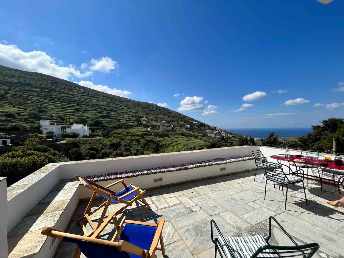 Ktikados गावाच्या काठावर असलेल्या अनोख्या सुधारित पारंपारिक सिक्लॅडिक घरात प्रवेश करा. तुमच्या बॅग्ज सोडा, अंगणाकडे जाणारे डबल दरवाजे उघडा आणि पर्वत आणि समुद्राच्या उभयचर दृश्यामध्ये स्थायिक व्हा! प्रॉपर्टीमध्ये अल फ्रेस्को डायनिंग, लाऊंजिंग आणि अतुलनीय सूर्यास्ताच्या दृश्यांसाठी आदर्श टेरेसची मालिका आहे. दिवसा तुम्ही बेटावरील अनोख्या स्थानिक कावळ्यांद्वारे फ्लाय - बाय्सची अपेक्षा करू शकता आणि सूर्य मावळल्यानंतर, दरीच्या मेंढ्यांकडून चांदण्यांना भेट देऊ शकता.