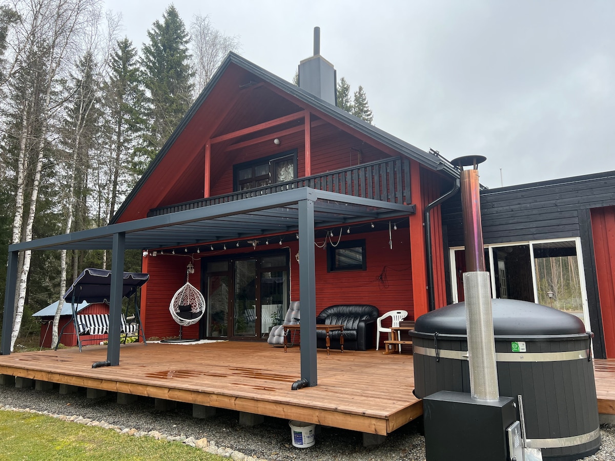 पार्क ऑफ रोडमध्ये शांतपणे स्थित कॉटेज. जर तुम्ही नैसर्गिक शांती आणि उत्तम जॉगिंग टेरेन शोधत असाल तर तुमच्यासाठी/तुमच्या कुटुंबासाठी येथे एक उत्तम पर्याय आहे. - खूप सुसज्ज स्की ट्रेल्स सुमारे 200 मीटर अंतरावर आहेत - स्नोमोबाईल सुमारे 200 मीटर अंतरावर सुरू होते - फ्रिस्बीगोल्फ्राटा - हिवाळ्यात, आईस स्विमिंगची शक्यता देखील असते - स्की रिसॉर्टपासून दूर एक लहान ड्राईव्ह - उन्हाळ्यात उत्तम हायकिंग टेरेन आणि बीच कॉटेजमध्ये इलेक्ट्रिक कार चार्जिंगचा पर्याय नाही!
