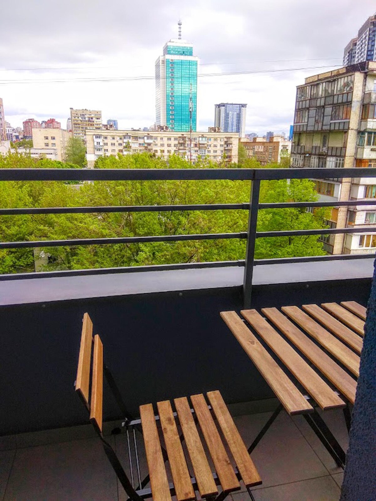 A cozy and modern hotel-type studio with elements of a loft style. The apartment is located on the 2nd floor. The building is located in the center of Kyiv near the shopping center "Gulliver", not far from the Olympic Stadium and Khreshchatyk Street, a 5-minute walk from the “Palace of Sports” metro station. The apartment has a king-size bed and, if it is necessary, an additional folding bed. The studio has a small kitchen, bathroom and toilet with everything you need, TV and Internet.