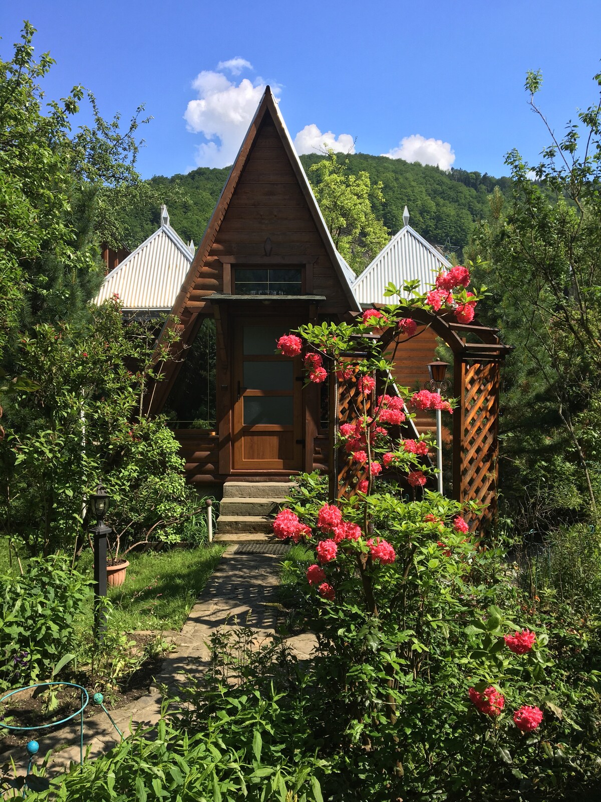 हे नव्याने बांधलेले कॉटेज युक्रेनियन कारपॅथियन्सच्या अतिशय शांत आणि नयनरम्य ठिकाणी आहे. यात 2 बेडरूम्स, किचन आणि लिव्हिंग एरिया आहे. 2, 5 बाथरूम्स :1 शॉवरसह, 1 बाथटबसह आणि 1 कॉमन जागेसाठी टॉयलेट आणि सिंकसह. सर्व रूम्स दर्जेदार साहित्य आणि लाकडी फर्निचरने सुशोभित केल्या आहेत, विशाल पॅनोरॅमिक खिडक्या आहेत. किचनमध्ये किचनवेअर, भांडी, घरगुती उपकरणे (कुकिंग स्टोव्ह, रेफ्रिजरेटर, डिशवॉशर, वॉशर) पूर्णपणे सुसज्ज आहेत. फायरप्लेस लिव्हिंग रूममध्ये आहे.