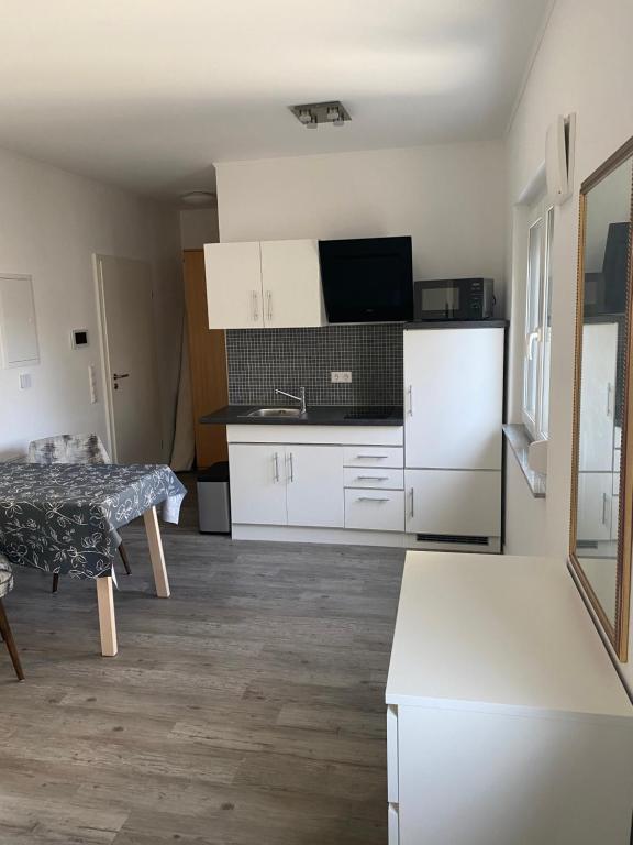 आमच्या छान तळघर अपार्टमेंटमध्ये हॉलवे भागात एक लहान किचन आहे. तेलामध्ये तळलेल्या खाद्यपदार्थांसाठी हे योग्य नाही. एक शॉवर रूम आणि बॉक्स स्प्रिंग बेड आणि एक मोठा फ्लॅट - स्क्रीन टीव्ही असलेली एक छान बेडरूम. वायफाय ॲक्सेस, साउंडप्रूफ खिडक्या, फ्रेडरिचसाऊ आणि सिटी सेंटर, रेवे, लिडल आणि बस स्टॉप दरम्यान 100 मीटर अंतरावर खूप चांगले लोकेशन. डाउनटाउन 15 मिनिटांच्या अंतरावर आहे. बॅकयार्डमध्ये खाजगी ॲक्सेस.