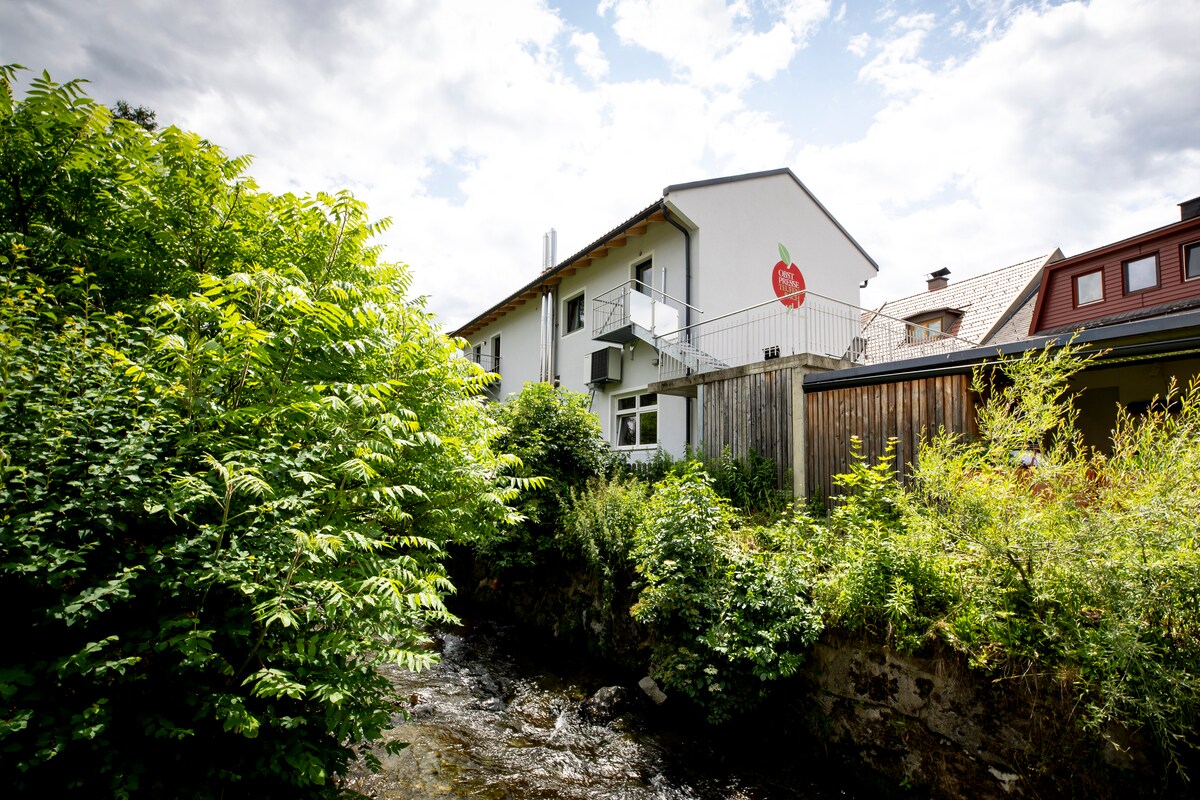 या शांत आणि मध्यवर्ती निवासस्थानामध्ये सुट्टीचा आनंद घ्या. तुमच्या विल्हेवाट लावलेले खाजगी विशाल टेरेस तुम्हाला इडलीक रशिंग स्ट्रीम व्यतिरिक्त विश्रांतीच्या वेळेची हमी देते. याव्यतिरिक्त, टेरेसवर एक आऊटडोअर सॉना आहे जो केवळ या अपार्टमेंटमधील रहिवाशांसाठी वापरण्यासाठी आहे. हे अपार्टमेंट 2023 च्या उन्हाळ्यात नुकतेच बांधले गेले होते. सर्व इन्व्हेंटरी नवीन आहे.