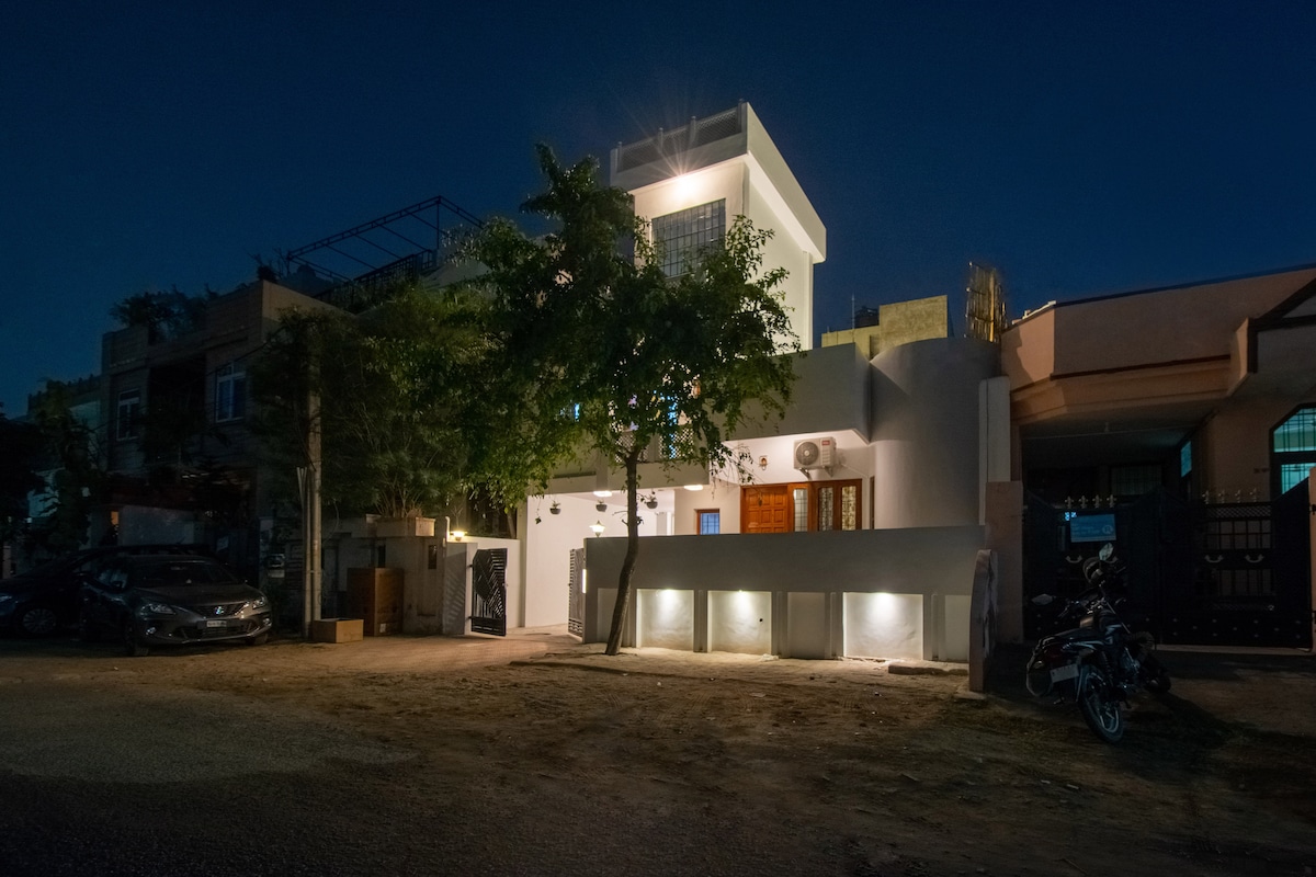 💎 तुमचे सेरेन आणि स्टायलिश रिट्रीट (नमस्कार! मी तुमचा होस्ट आहे आणि माझ्या घरी तुमचे स्वागत करण्यासाठी मी आतुर आहे!) या अविश्वसनीयपणे प्रशस्त आणि शांत व्हिलामध्ये तुमच्या चिंता विसरून जा आणि खरोखर आराम करा! जयपूरमध्ये ही एक खऱ्या अर्थाने लक्झरी सुटकेची जागा बनवण्यासाठी मी माझे मन भरले आहे, जे सुविधा आणि भोगवटा दोन्ही शोधत असलेल्यांसाठी योग्य आहे. वैशाली नगरमधील शोधलेल्या नेमी सागर कॉलनीमध्ये स्थित, तुम्ही शहराच्या सर्वोत्तम पत्त्यांपैकी एकामध्ये स्थायिक होत आहात.