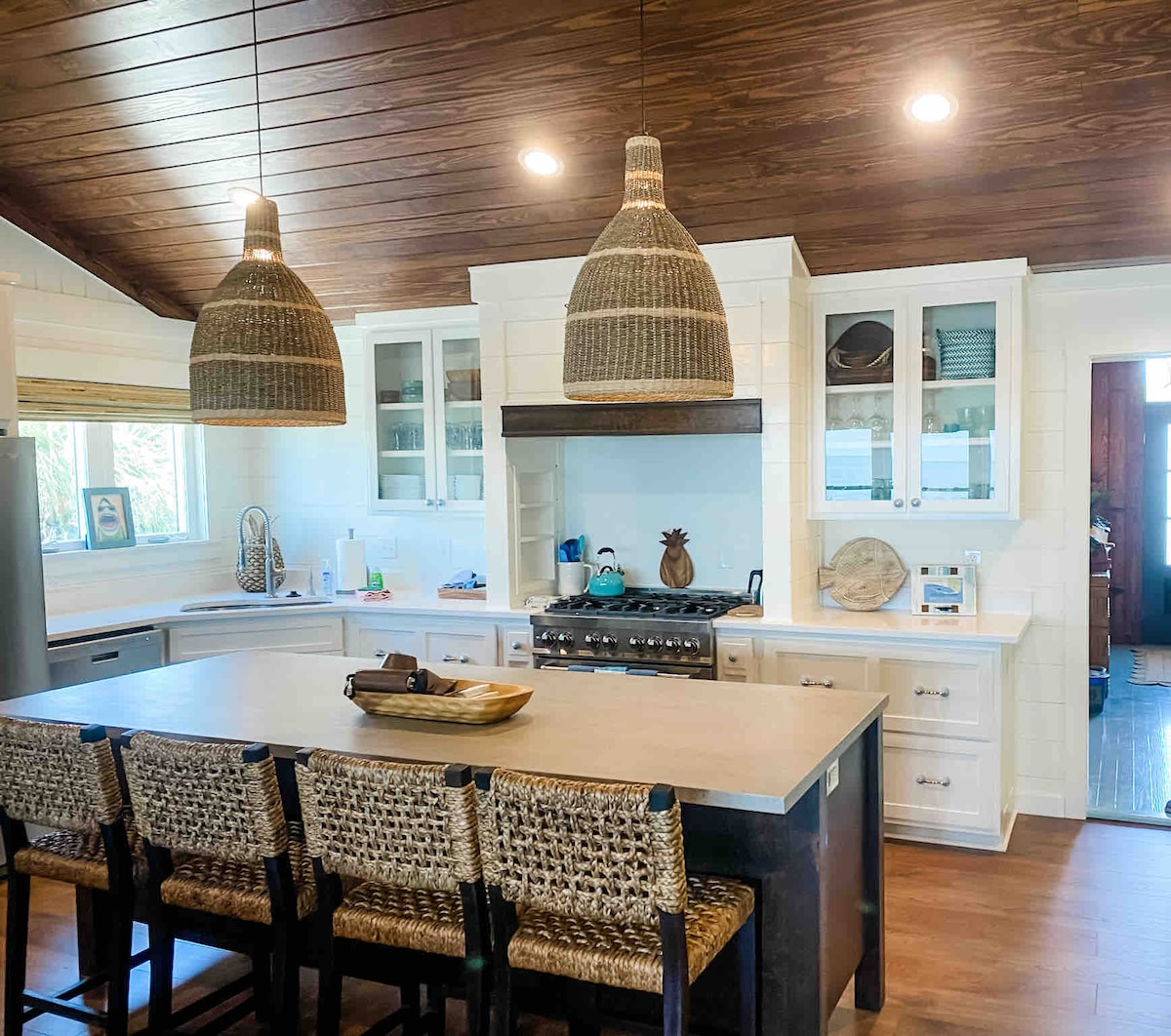 संपूर्ण कुटुंबासह आराम करा, मुलींच्या वीकेंडचा आनंद घ्या किंवा या अप्रतिम गल्फ फ्रंट होममध्ये खाजगी जोडप्याचे रिट्रीट घ्या. बीचवर फिरायला जा, सुंदर सूर्यास्ताचा आनंद घ्या किंवा टिकी हट किंवा मरीना (रस्त्याच्या पलीकडे) येथे नवीन मित्रांना भेटा. डेकमधून किंवा आतल्या लिव्हिंग एरियामधून डॉल्फिन आणि बर्डवॉच पहा. स्वयंपाक करायला आवडतो का? किचनमध्ये डबल ओव्हन्स आणि वाईकिंग गॅस स्टोव्ह आहे. फुटबॉल गेम पहा आणि खालच्या मजल्यावरील पोर्च टिकी बारमधून कॉकटेलचा आनंद घ्या किंवा हॅमॉकमध्ये झोपा.